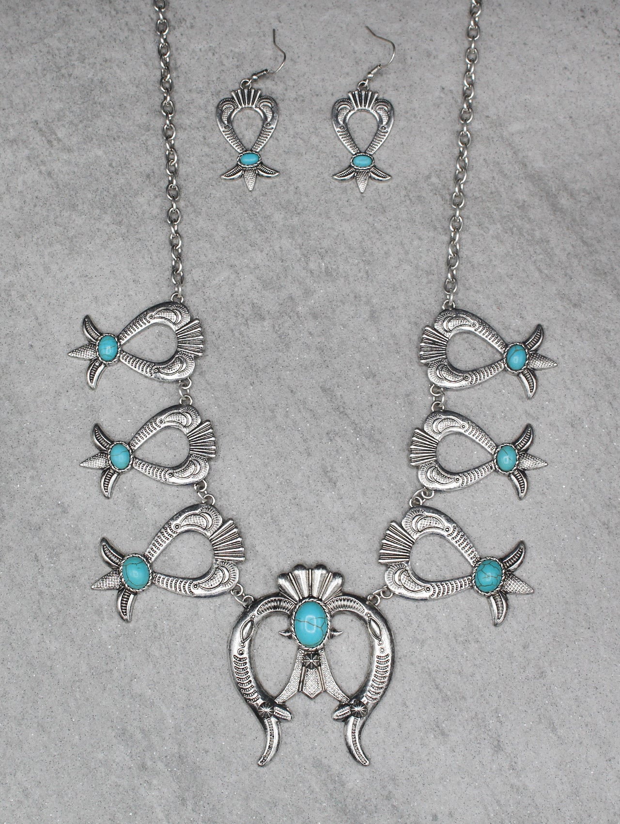 This Squash Blossom 24' Necklace is paired with squash blossom dangle earrings. This set is an eye catcher. Wear individually or together for the perfect western look. The 24" necklace would be perfect with wearing with other faux silver varnished pearls.