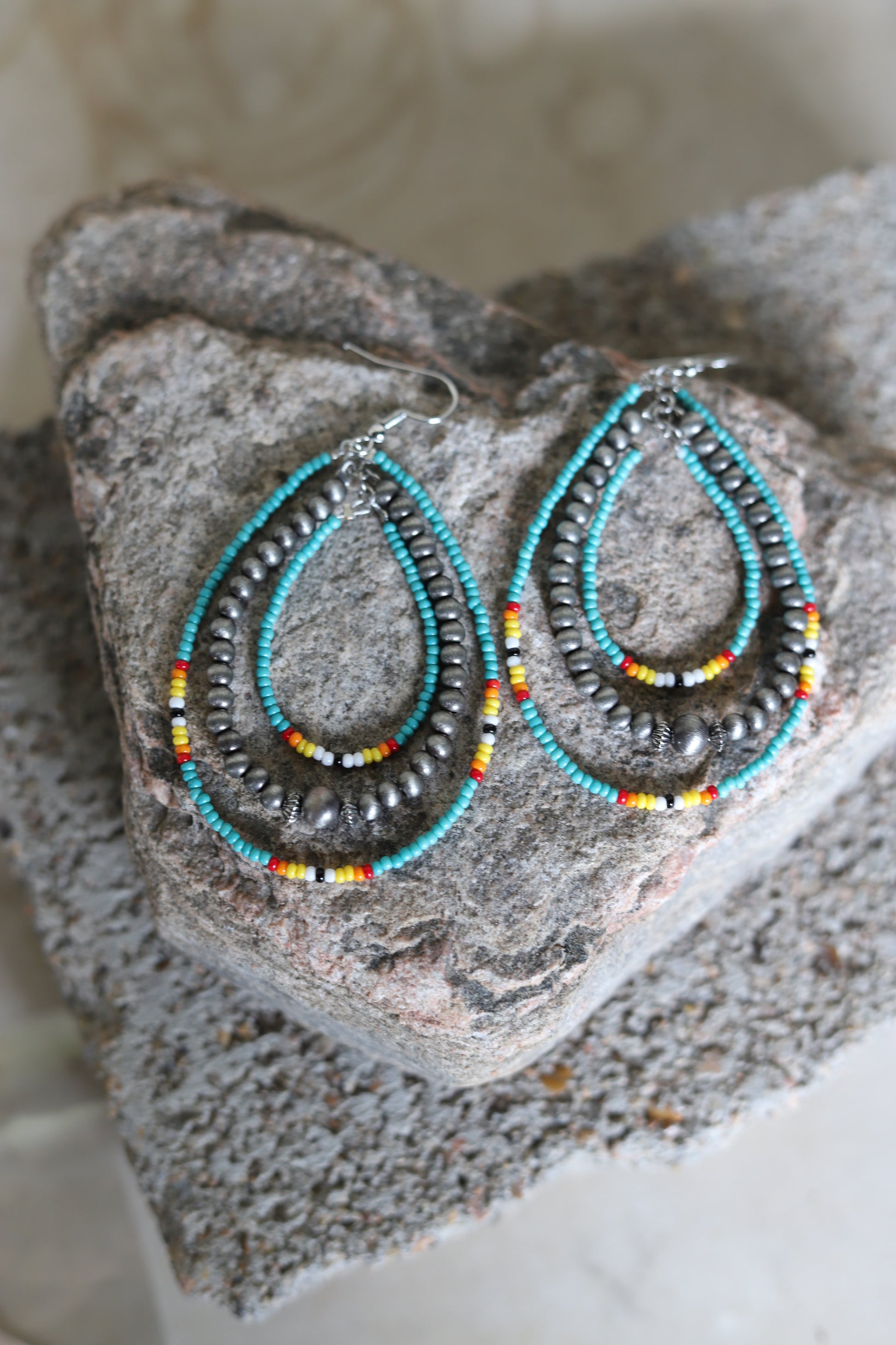 0030 T173 TURQ DOUBLE HOOP FAUX SILVER BEAD WITH SEEDBEAD MULTI ER
