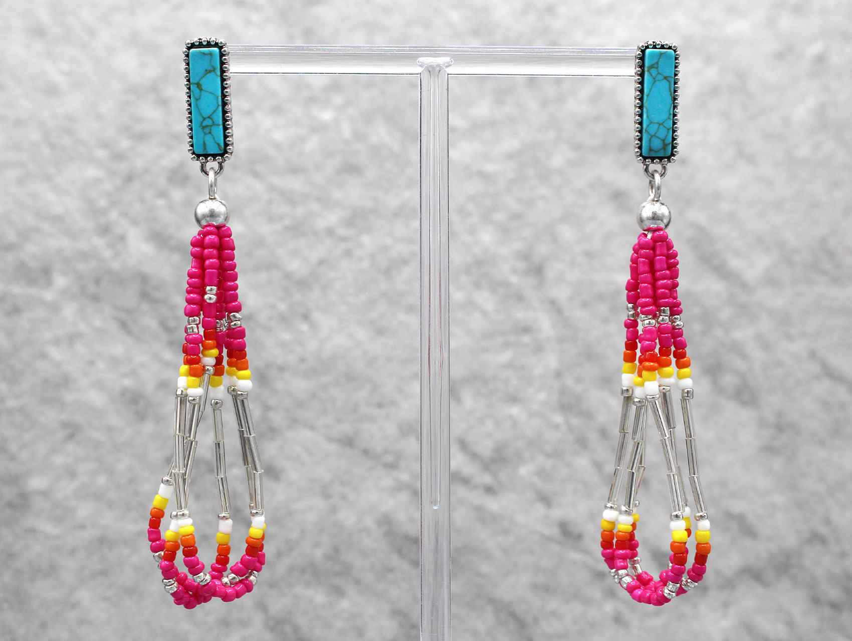 These handcrafted drop earrings feature a striking combination of materials and colors suited for boutique collections with a Southwestern or boho aesthetic. Each earring showcases a rectangular turquoise stone with veining detail, bezel-set in a silver-toned frame with beaded edging. Suspended from this top piece is a cascading teardrop formation made from multicolor seed beads—primarily fuchsia, orange, yellow, and white—interspersed with silver-tone spacer beads and elongated tube beads for structure and movement.