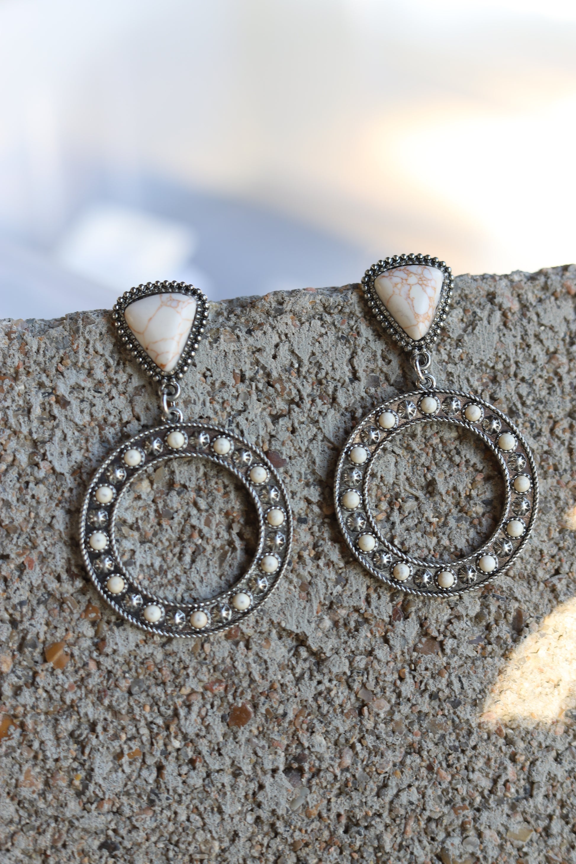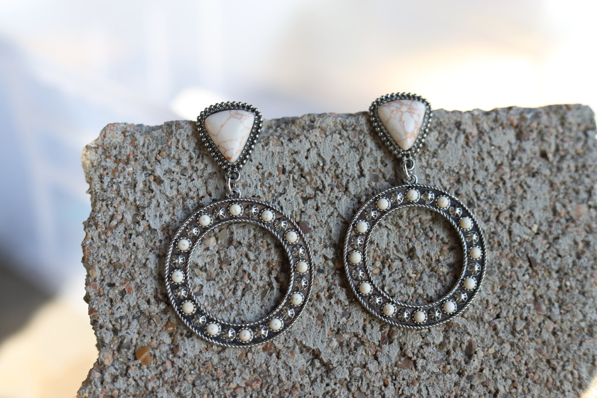 Triangle-shaped stone stud with a ring dangle that has stones and stamped fashion metal around the ring .Made in China. Fashion