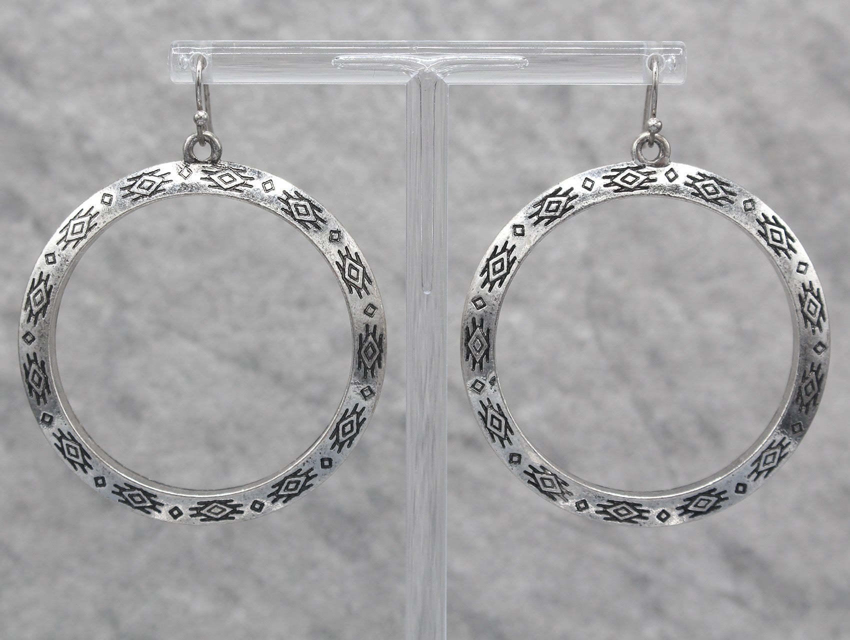 These silver metal hoop earrings have an eye-catching look to them with engraved western textured hoops. Comfortable to wear with a fish hook and perfect sized hoops.