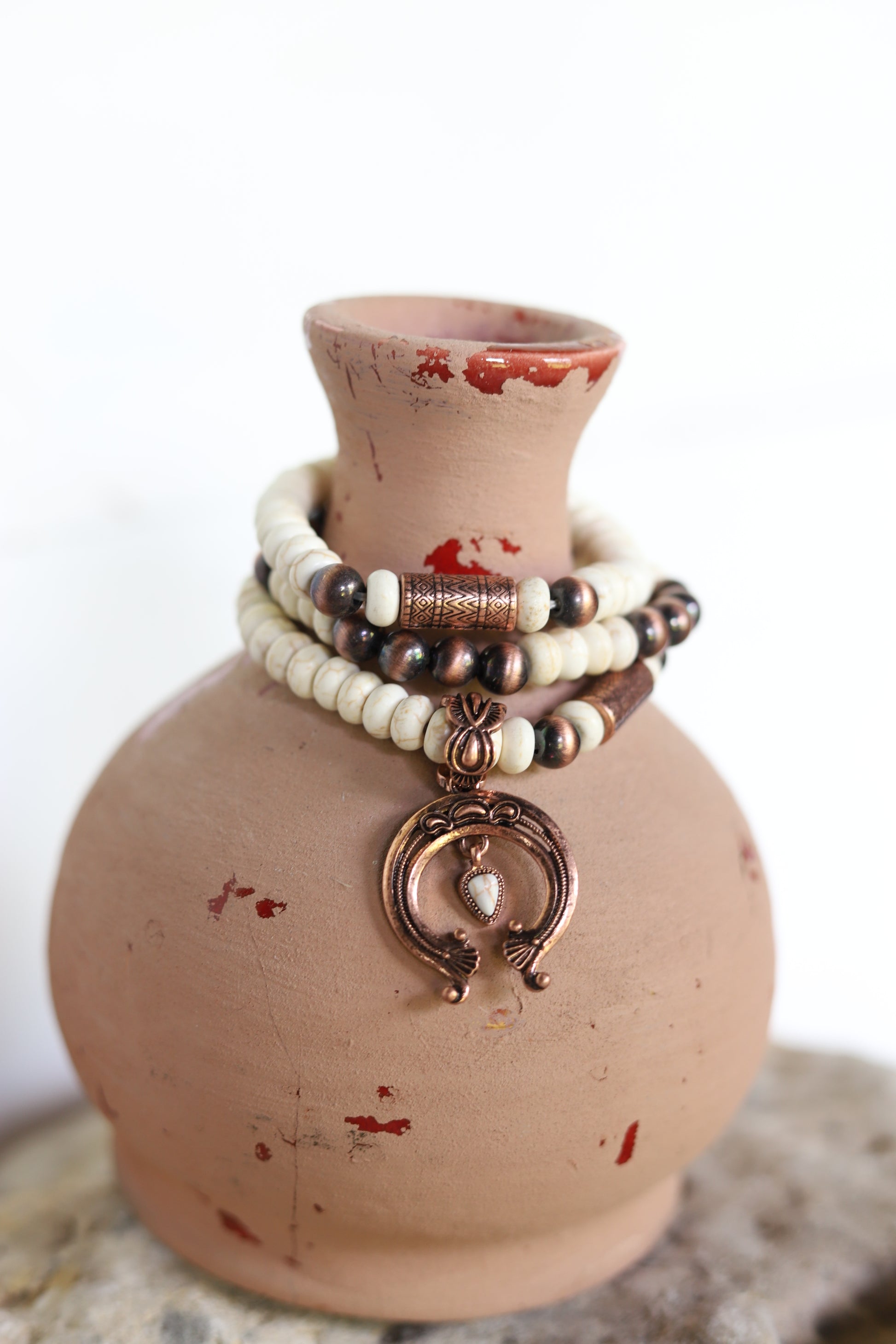 This 0300-H214 bracelet features 3 strands of bone and burnish copper beads on a stretch cord. Included is 1 1/2" Naja inspired fashion charm. Matching necklace available to purchase separately
