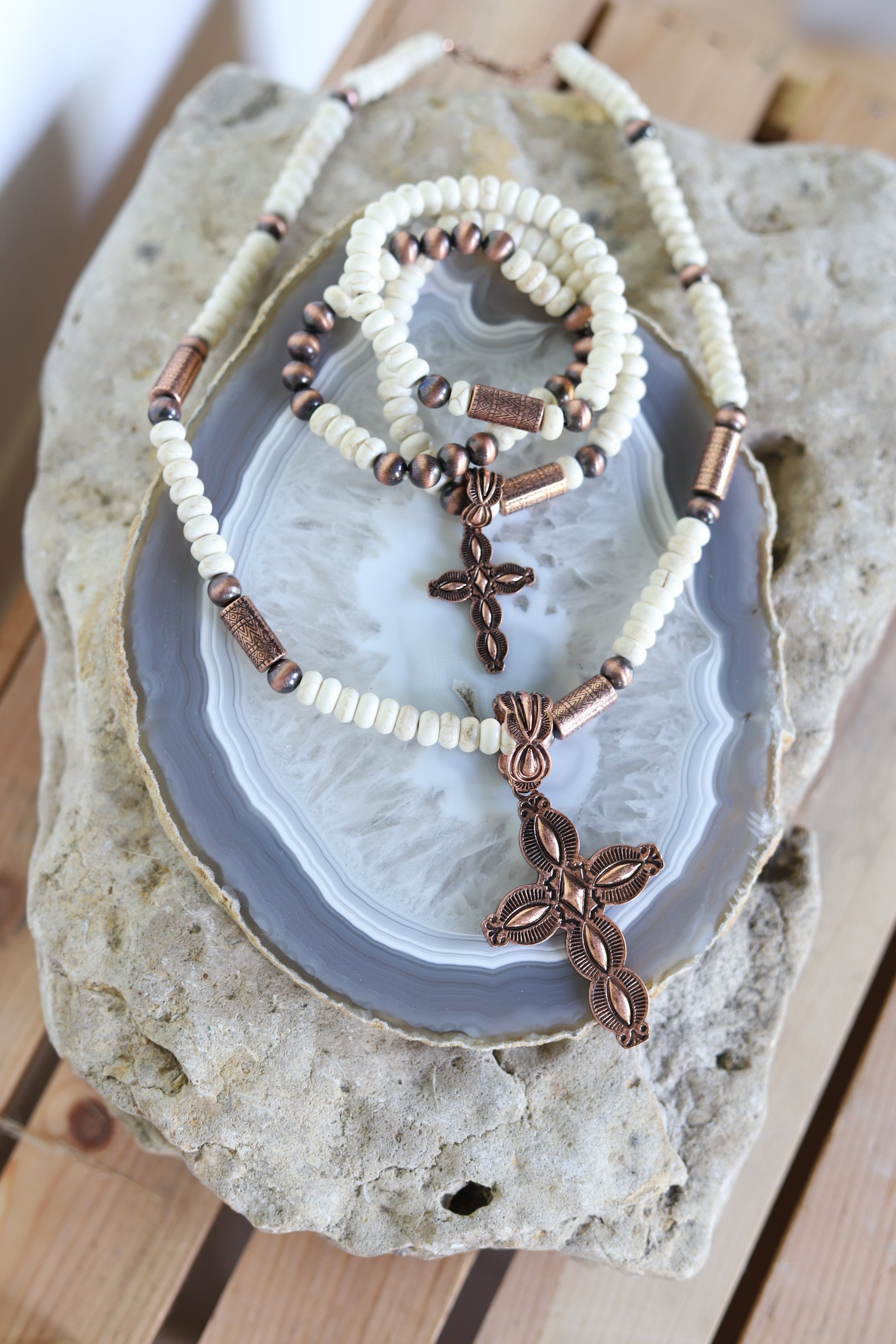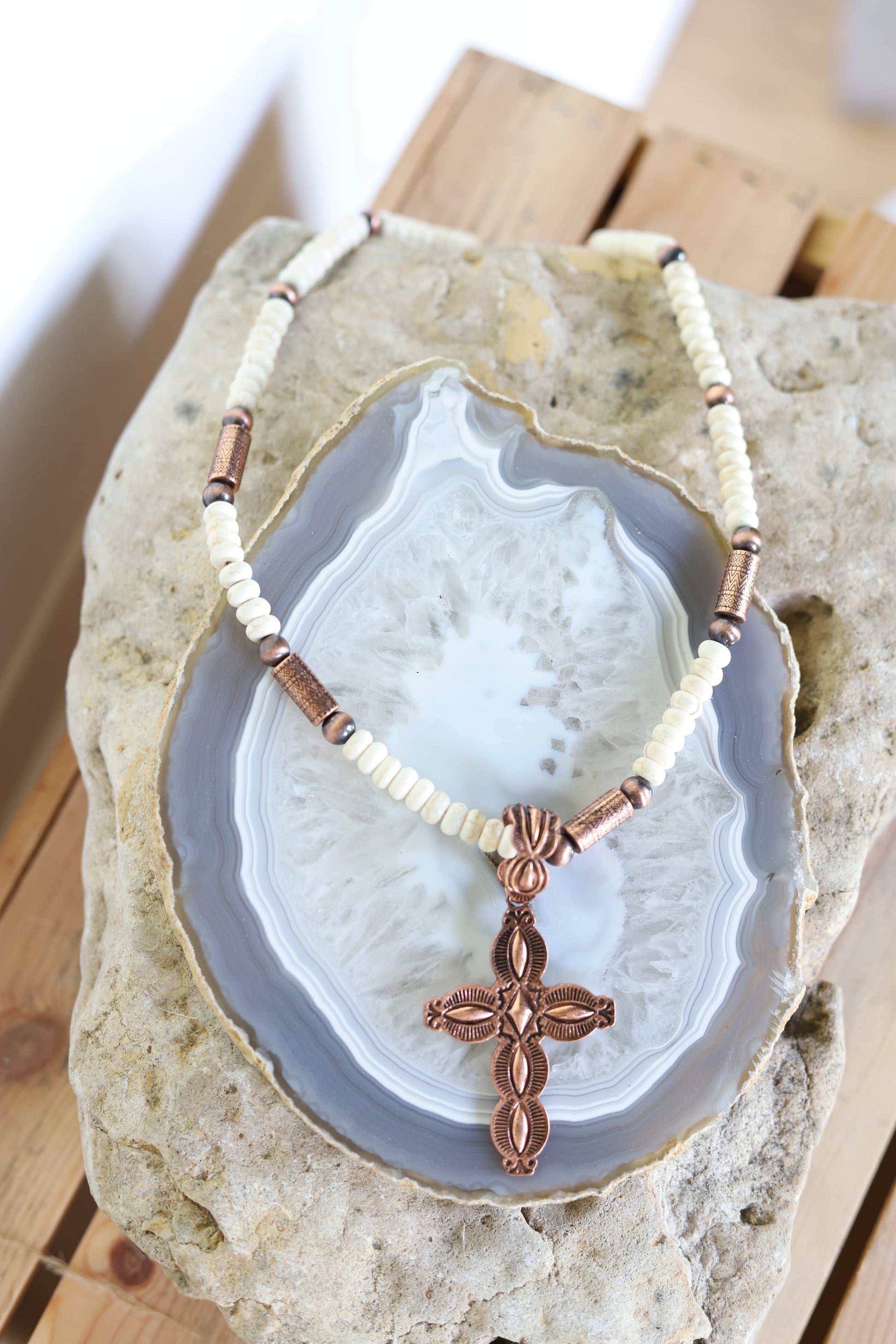 This necklace measures 21 inches in length and features a 3-inch copper cross pendant.
