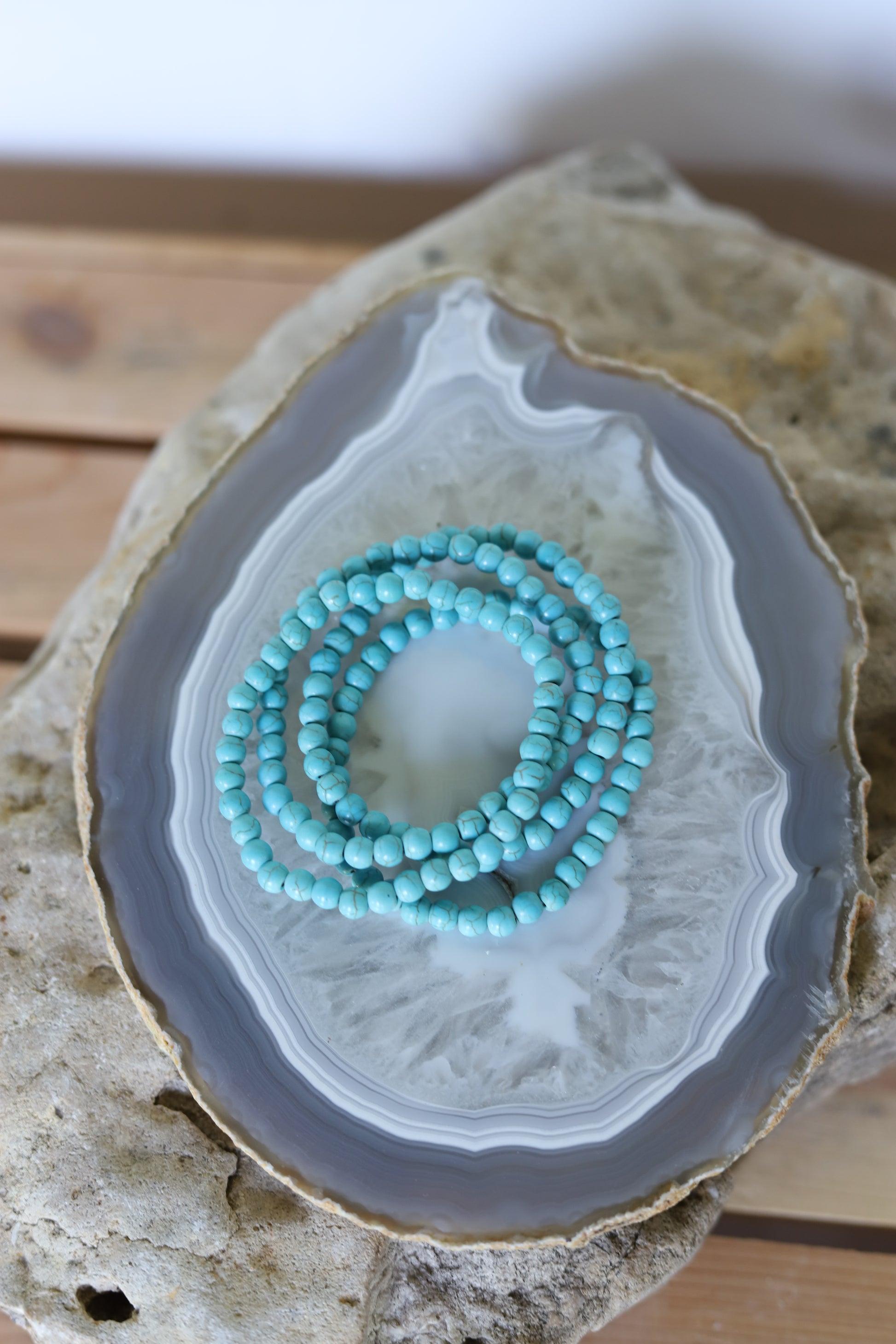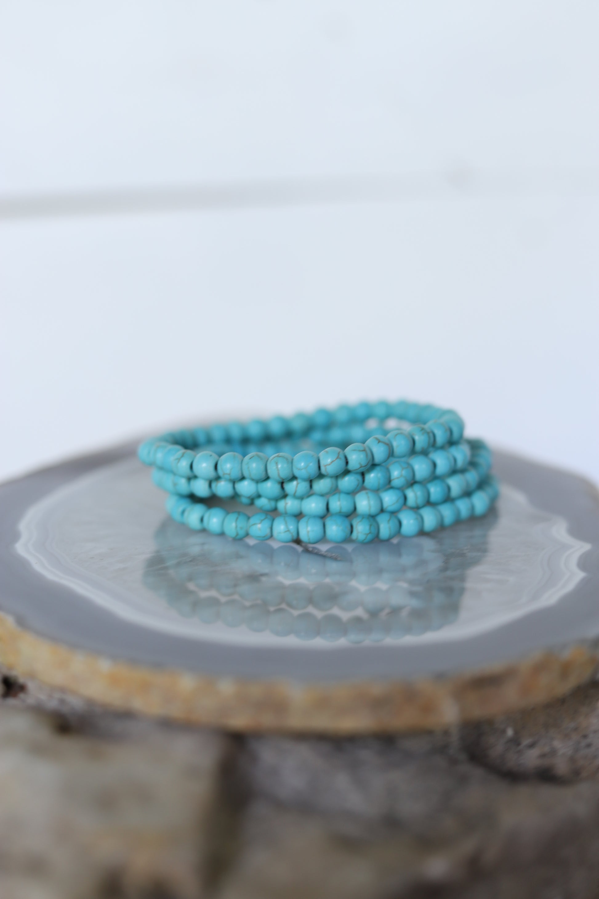 This turquoise-colored beaded strand is composed of uniformly shaped round beads with light veining, mimicking the appearance of natural turquoise. The beads are likely made from howlite or synthetic turquoise, commonly used for consistent color and affordability in bulk jewelry production. The strand appears to be long enough for multi-wrap bracelet or necklace use, and it is currently shown coiled for presentation.