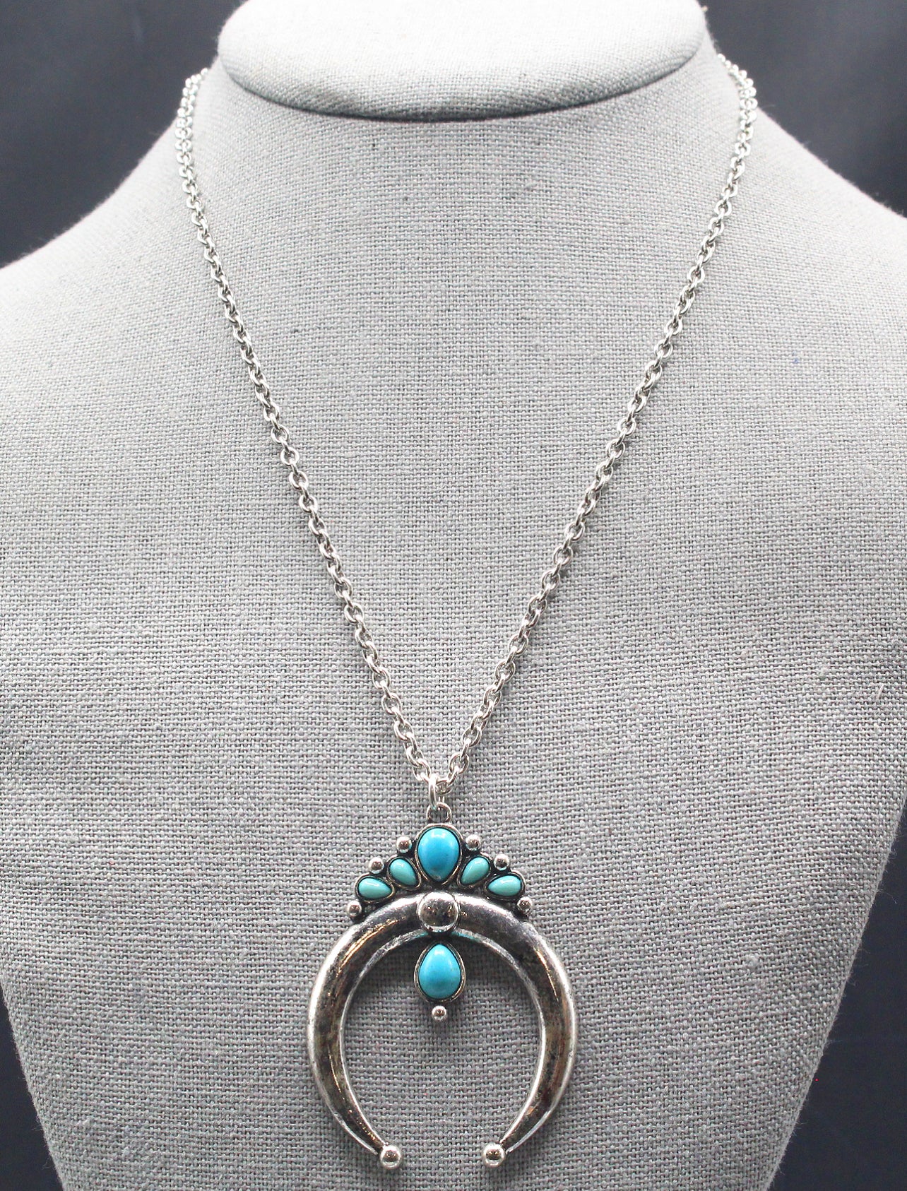 This is a 20" chain with a crescent pendent that has 5 turquoise beads scalloped on the top and a single tear drop in the middle of crescent. Lightweight.
