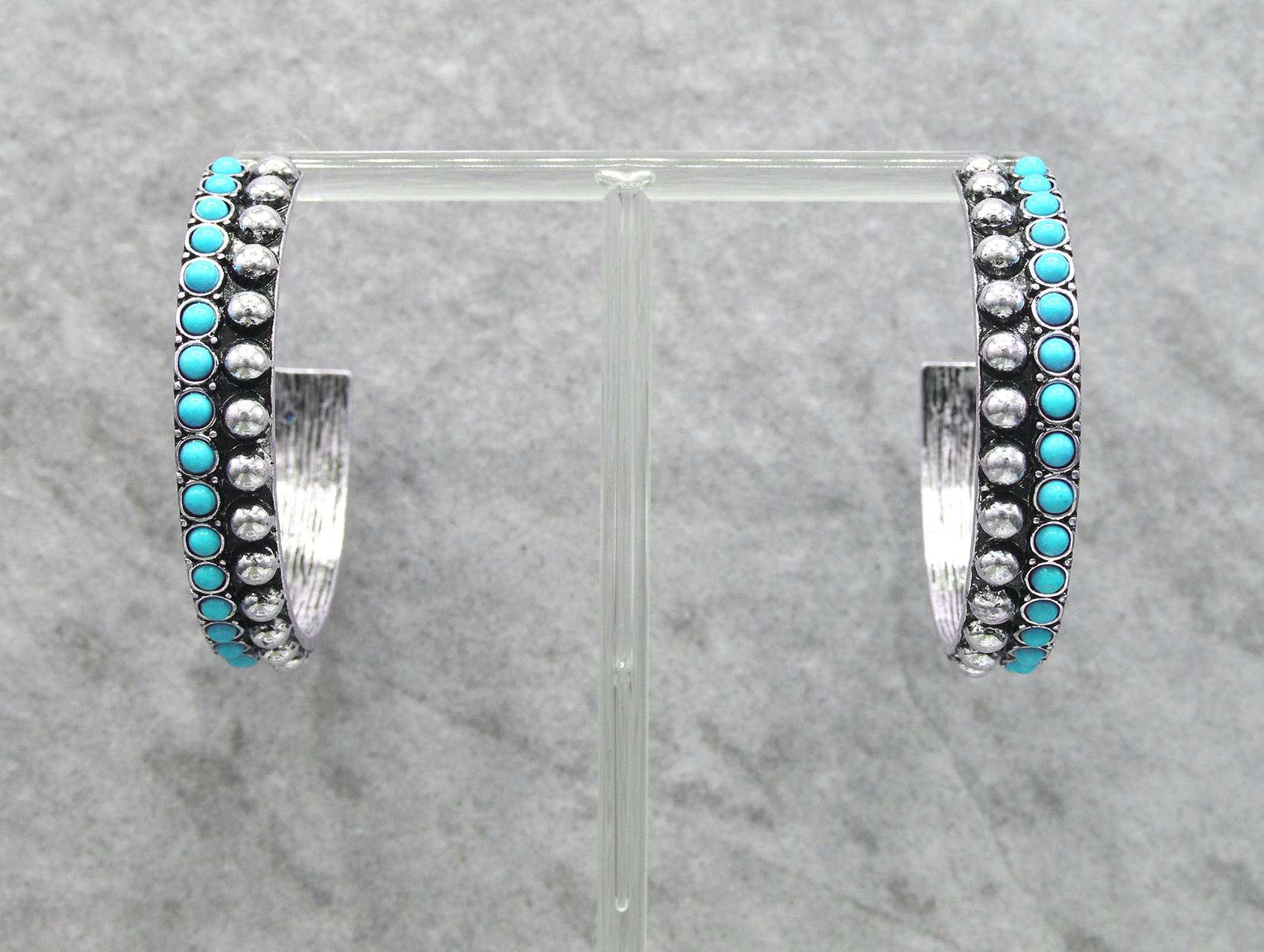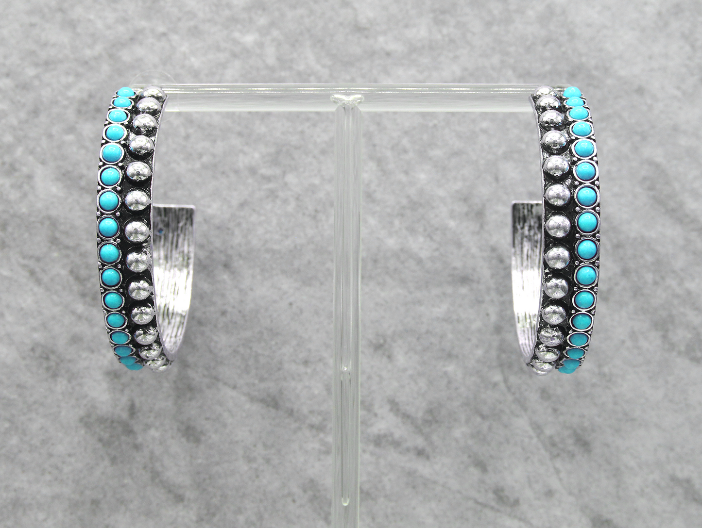 These bold half-hoop cuff earrings feature a dual-row design with alternating textures. One row is set with small round turquoise-colored stones, while the adjacent row displays raised silver-tone dome studs. The antique silver finish enhances the contrast between the vibrant turquoise and oxidized metal. These earrings offer a structured, Western-inspired look with a secure post-back closure.