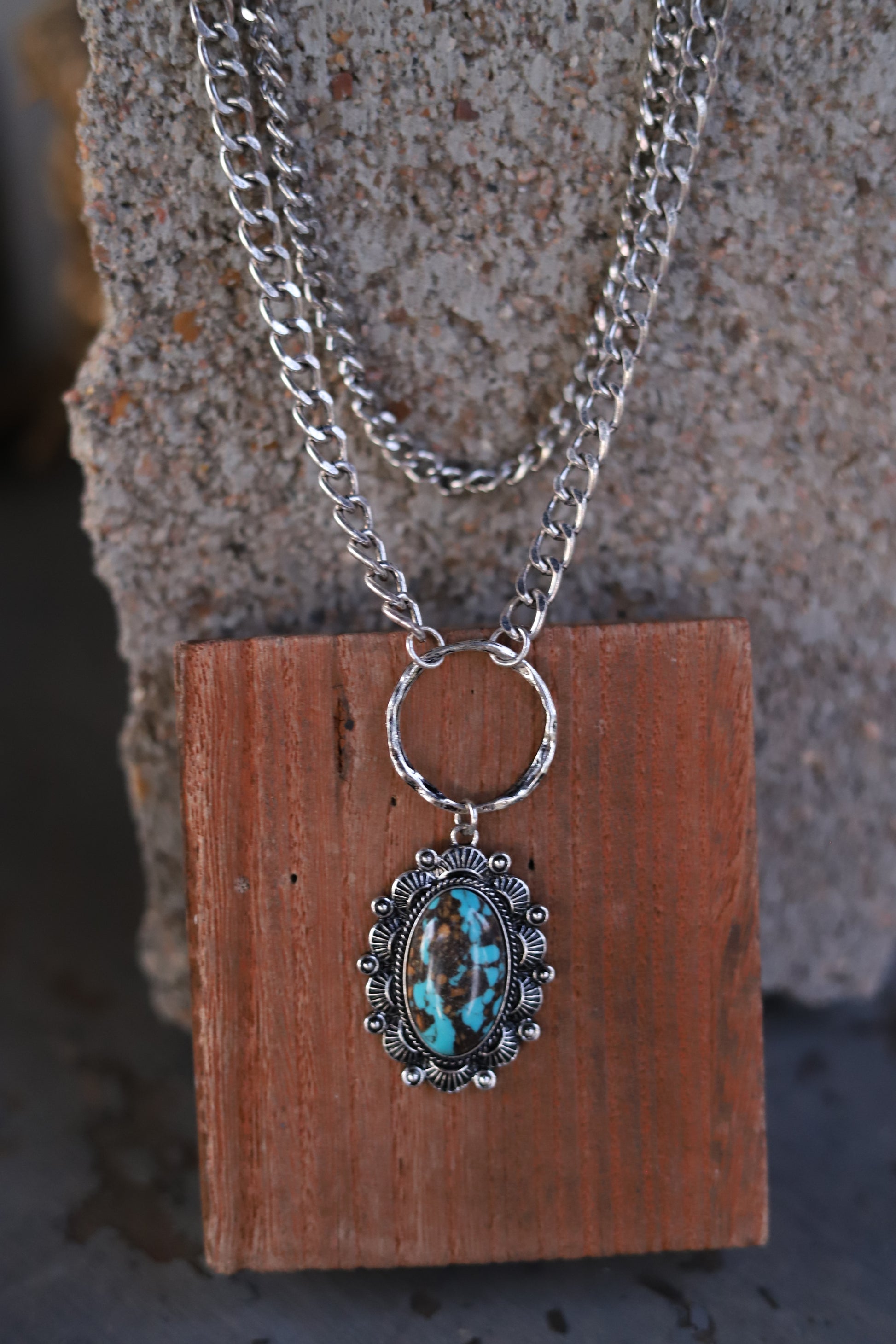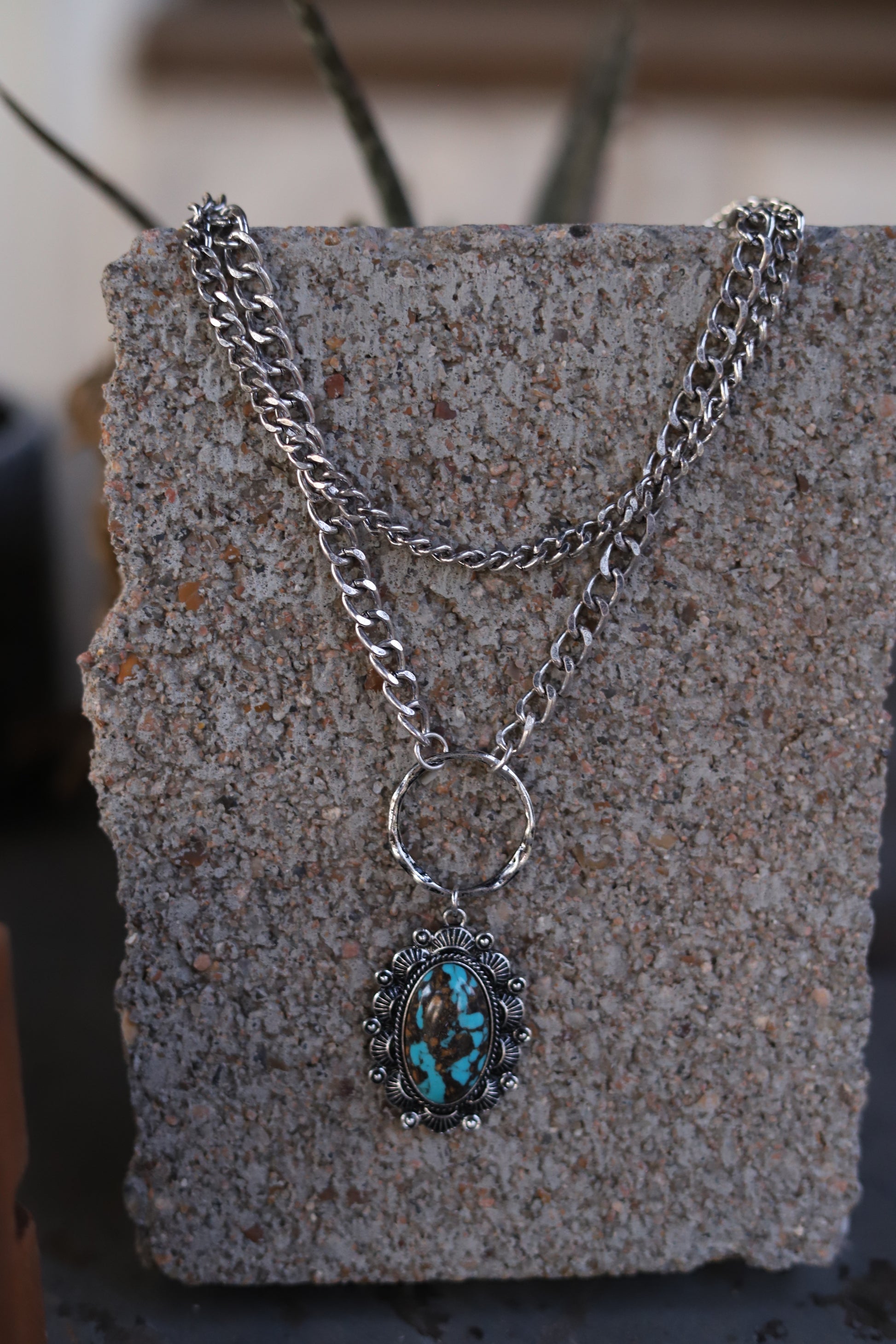 This 2 Layer Western Turquoise Stone Charm Necklace is a western style piece of jewelry. Its two-layer design features a turquoise stone center, surrounded by silver-like metal for a simple yet stylish look. Perfect for a special occasion or everyday wear with adjustable chain. Fashion jewelry, made in China.