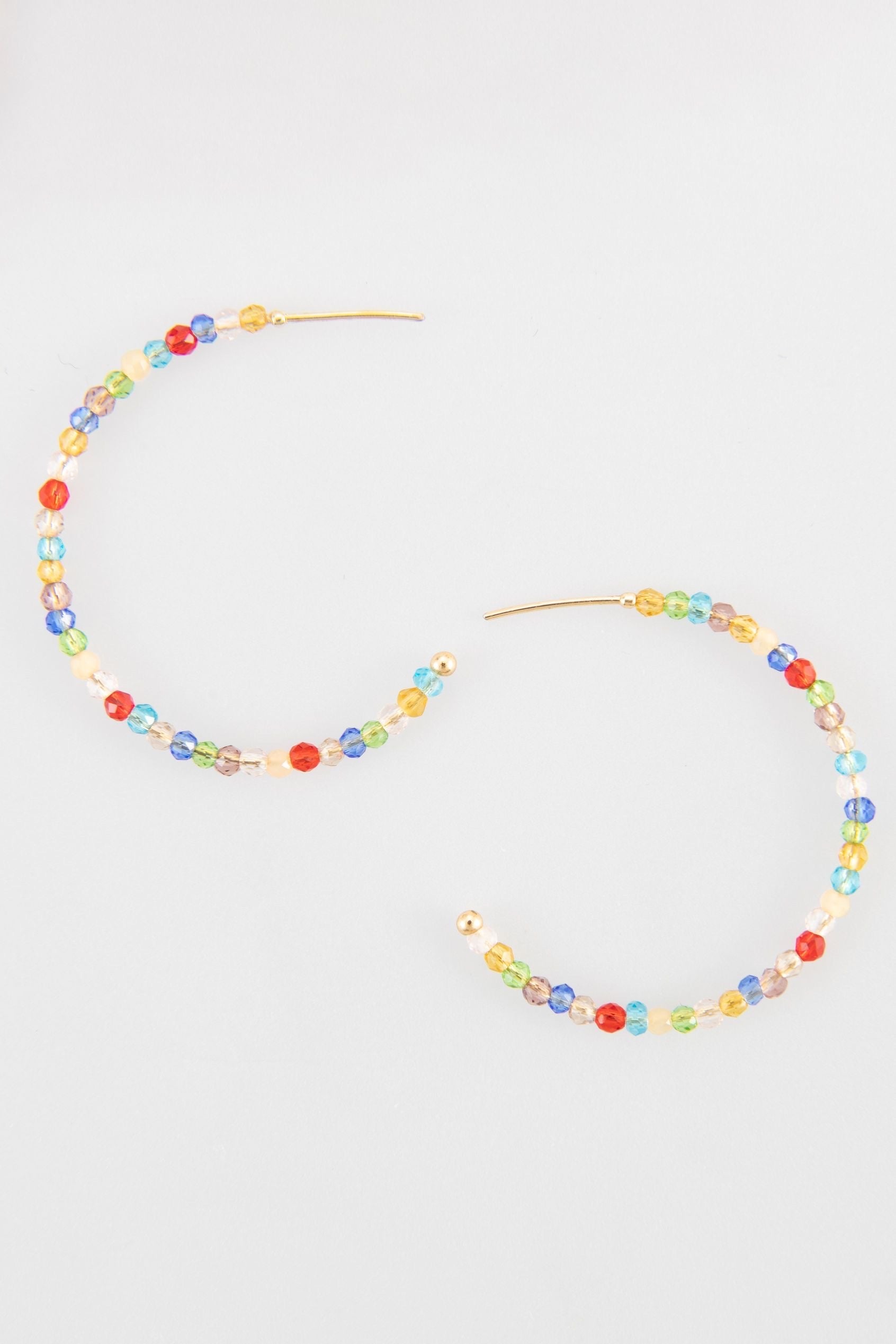 These vibrant hoop earrings feature an array of multicolored beads strung along a sleek gold-tone wire, adding a playful pop of color to any look. The lightweight design ensures comfort, making them ideal for all-day wear. The semi-transparent beads create a subtle shimmer, while the gold-tone accents provide a touch of elegance. Perfect for boutiques looking to offer fun, eye-catching accessories that suit a variety of styles, from casual outfits to festive occasions.
