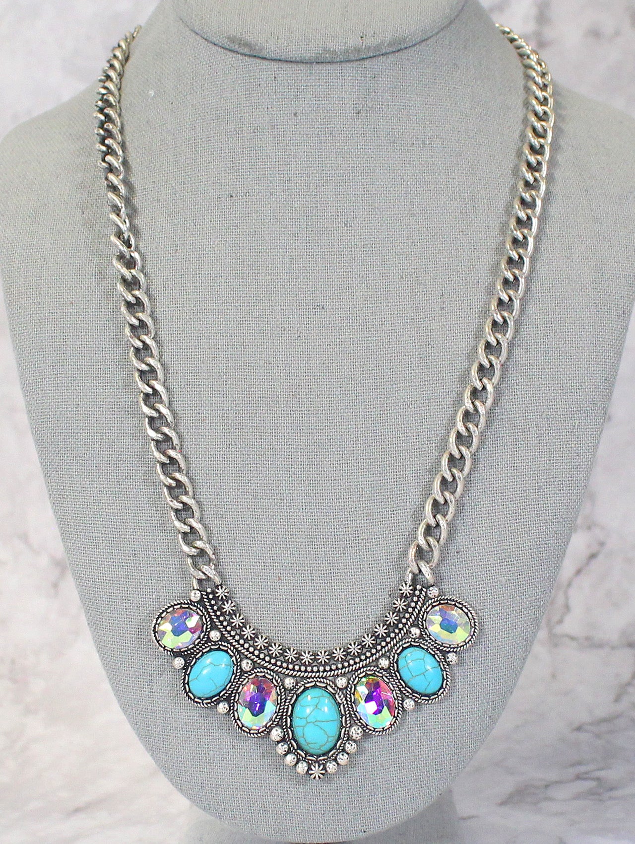 This silver chain western style statement necklace adds the perfect amount of flair to your outfit. With turquoise stones and crystal rhinestones, it has a silver metal western design around them.