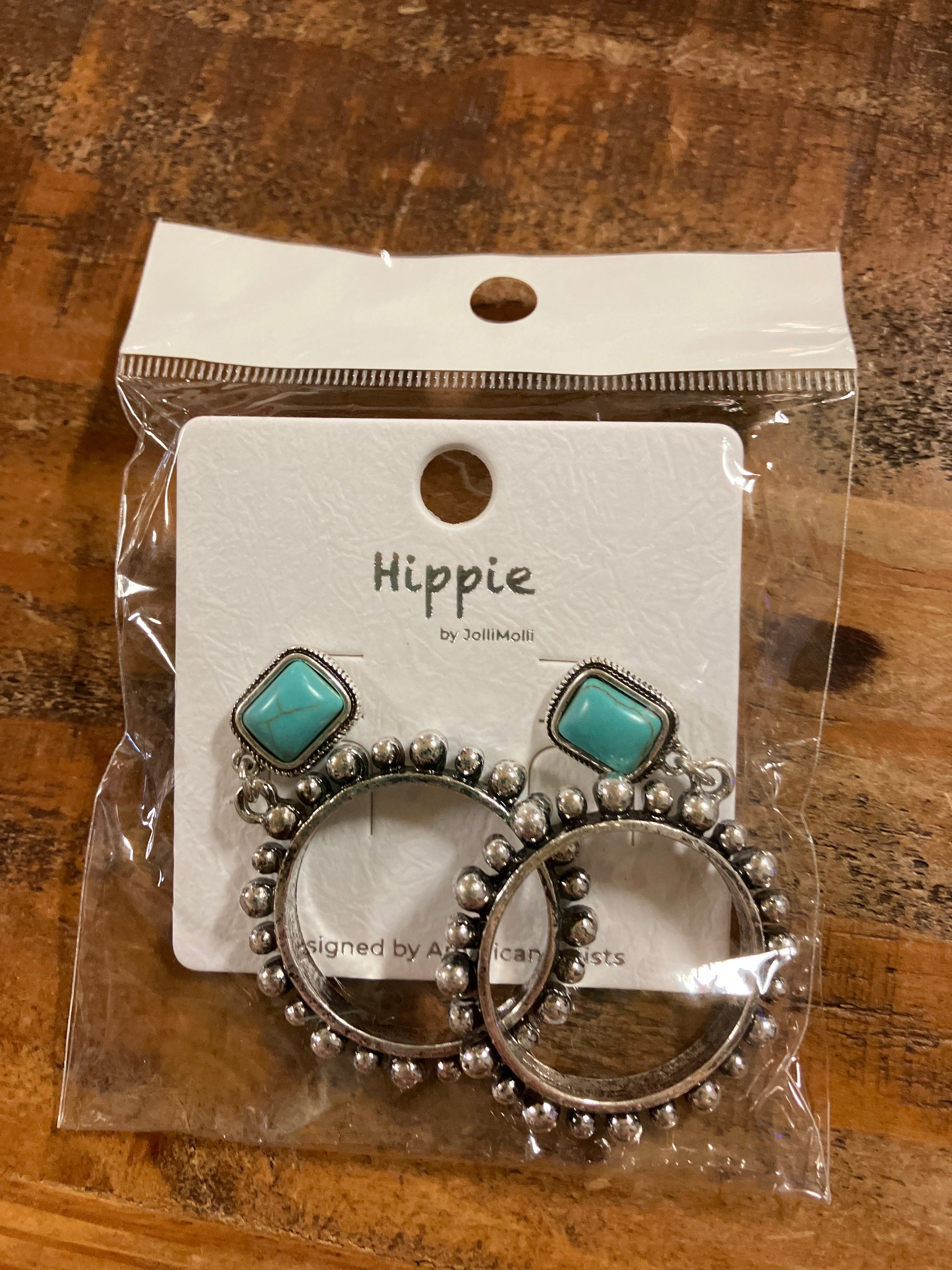 These statement dangle earrings feature a bold circular hoop accented with evenly spaced raised bead details, all in an antique silver-tone finish. Each earring is topped with a square faux turquoise stone set in a decorative bezel.