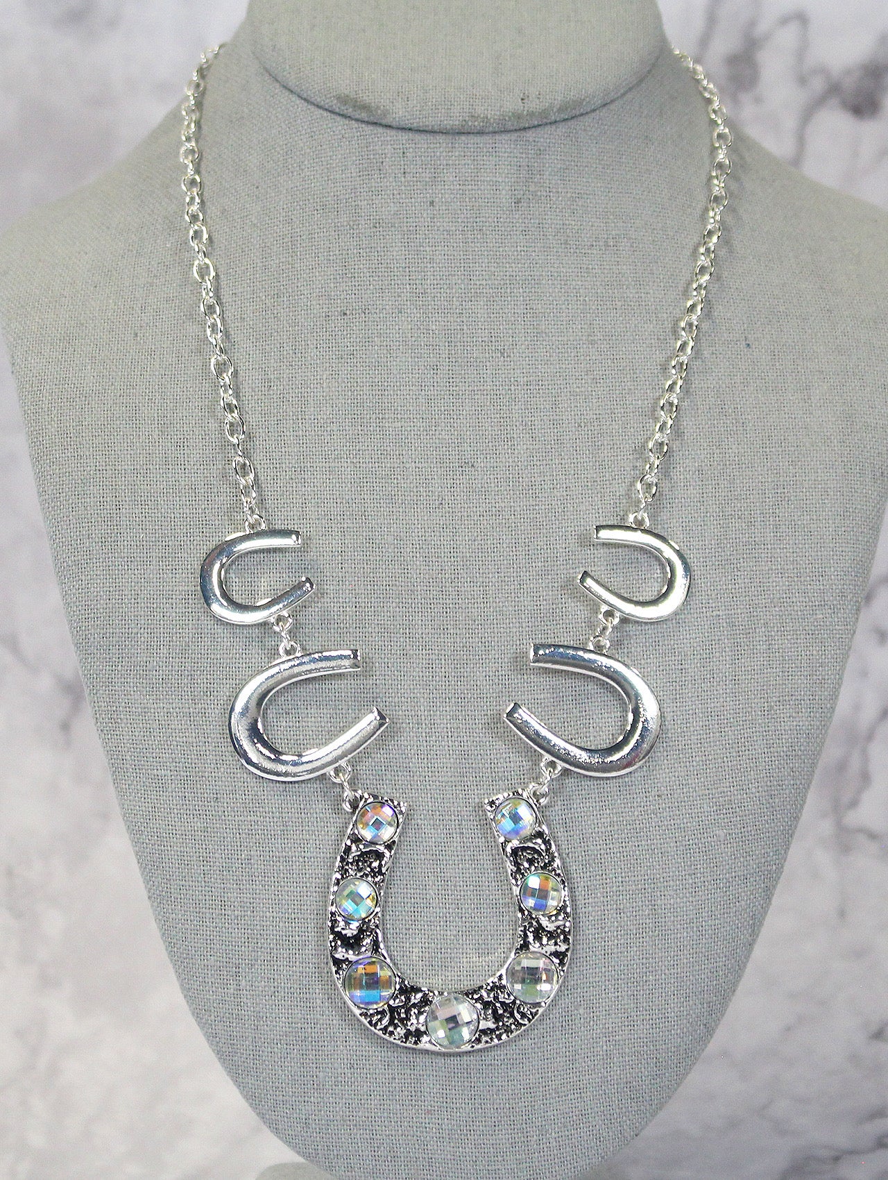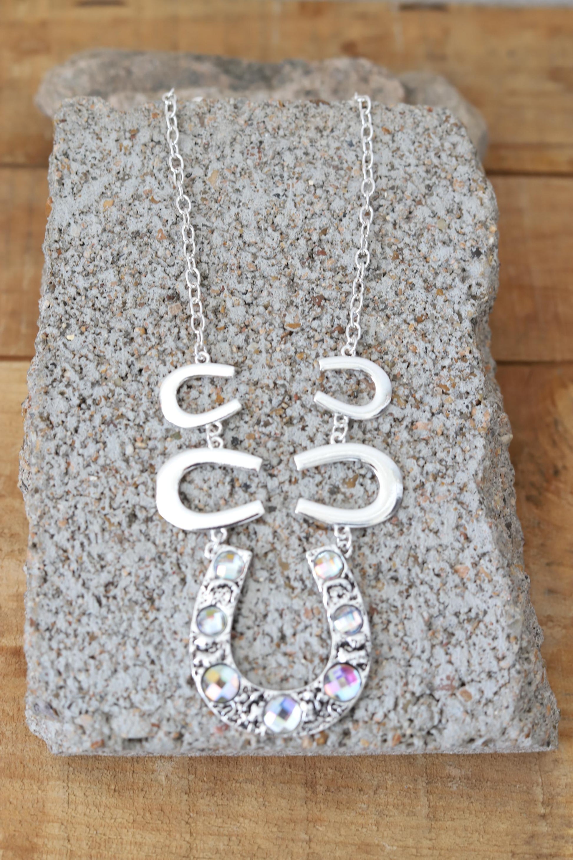 3 layered linear design, this necklace features a solid silver chain of 16", hand beaded bone stone and faux silver beads on a 17" middle chain, and a longer 18" chain with the same beaded details. Complete your look with this versatile and stylish 3-strand piece.