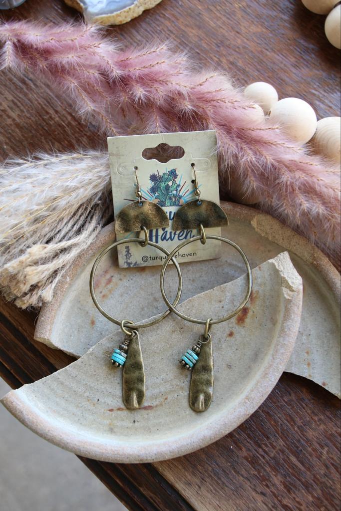 Antique gold hammered earring, half circle, hoop and dangle with turquoise charm