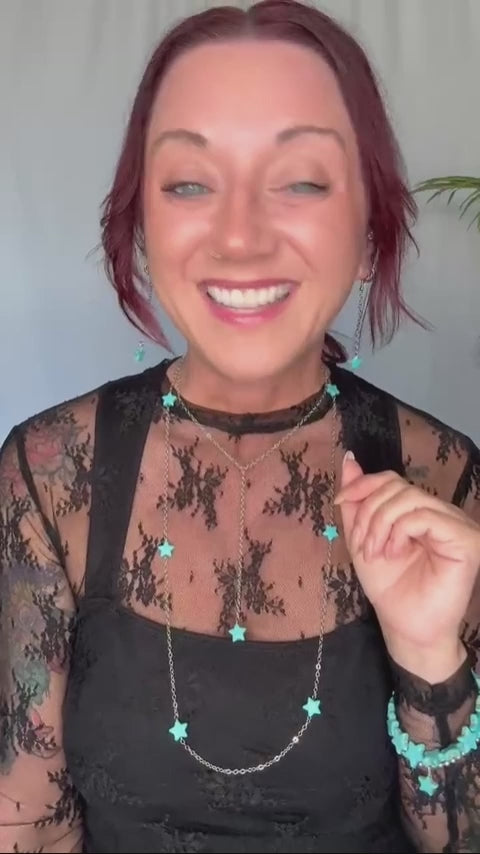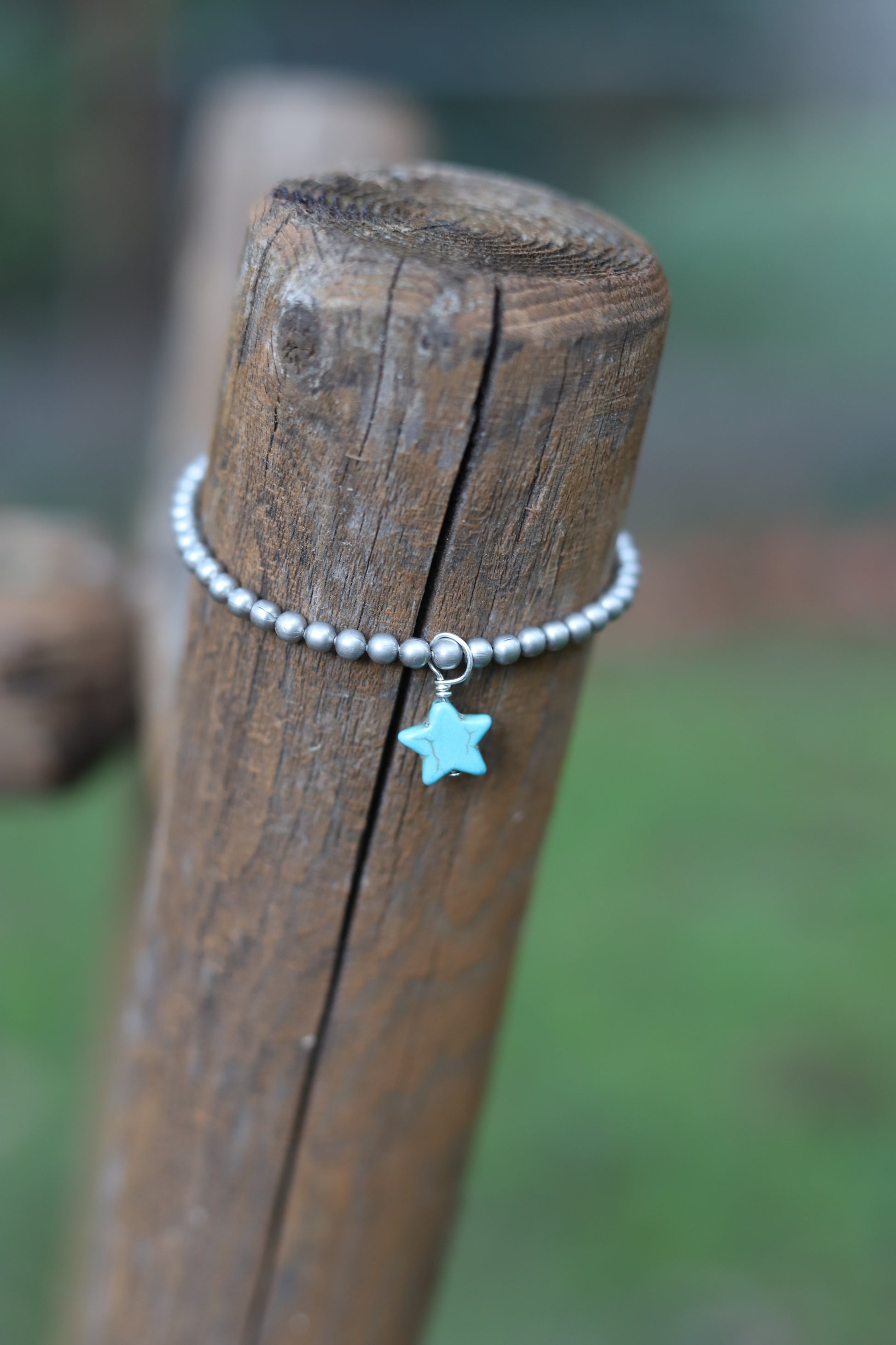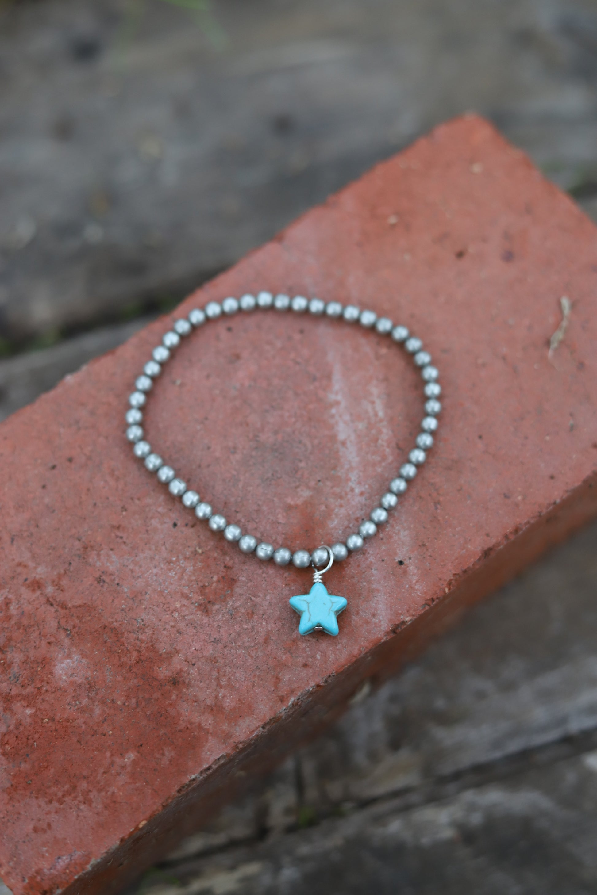 Add a little charm to your wrist with this Turquoise Star Stretch Bracelet! Handmade with small silver beads and a pop of color from the turquoise star, it’s comfy enough to wear all day thanks to its stretchy design. Perfect for stacking or rocking solo, it’s a simple yet stylish way to add personality to any outfit.