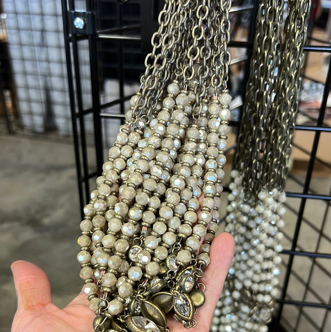 Crystal chain necklace with champagne crystal and antique gold hammered hoop drop.