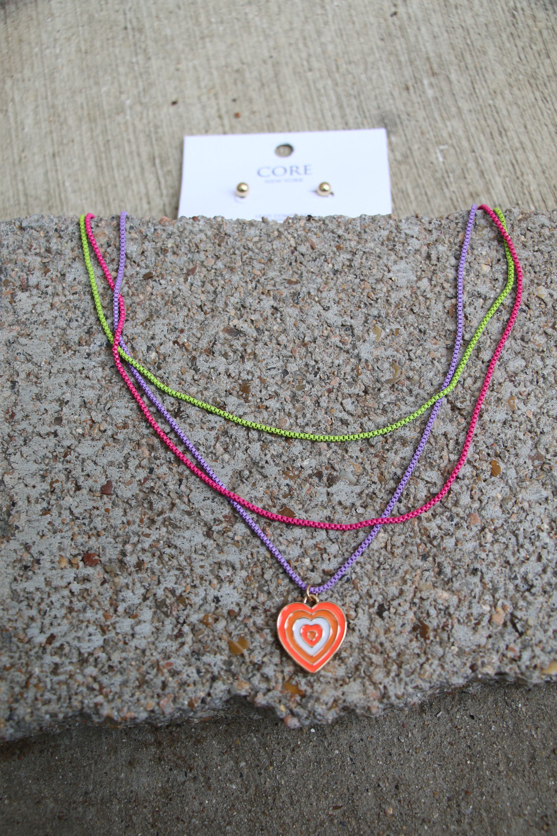 Introducing our 3 Strand Bright Color Chain Necklace with a Fun heart charm, a vibrant and playful accessory that is perfect for adults and teens alike. This eye-catching necklace is designed to add a touch of fun and charm to any outfit, making it a must-have addition to your accessory collection.