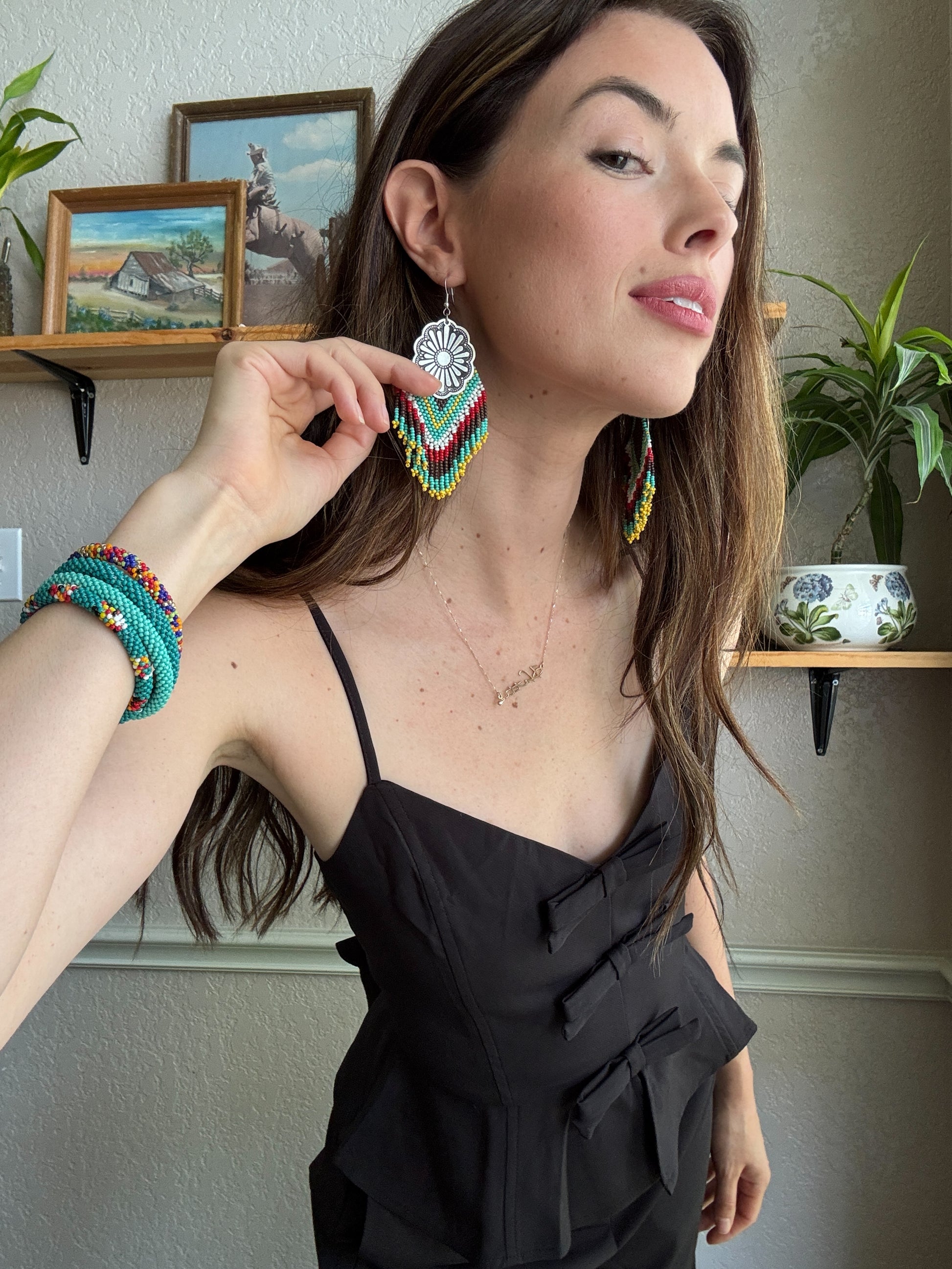 These statement earrings feature a hand-beaded chevron fringe design in bold multicolor rows including green, red, black, yellow, and white. Each earring is topped with a lightweight silver-tone metal piece shaped like a floral medallion, adding structure and contrast to the fluid beadwork.
