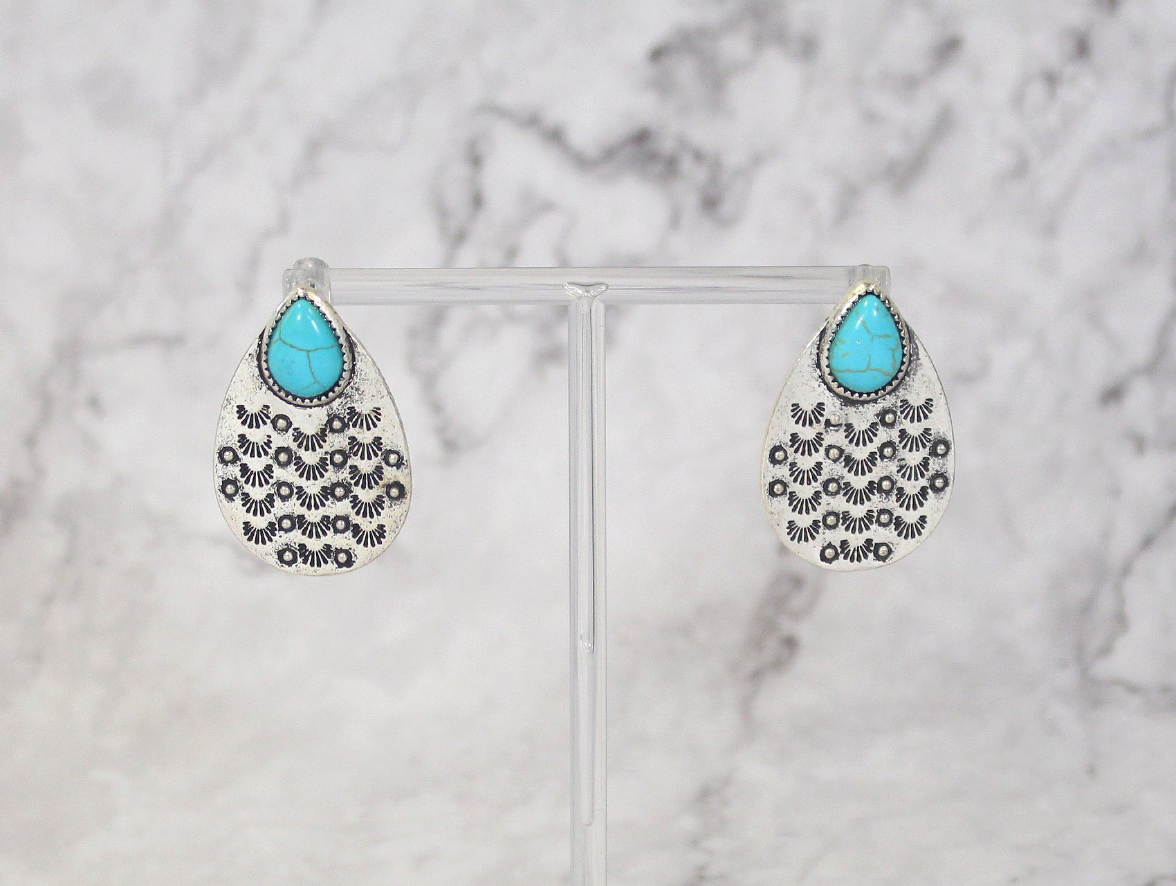 These earrings have a silver metal western engraved tear drop shape, with a turquoise tear drop shaped stone at the top.