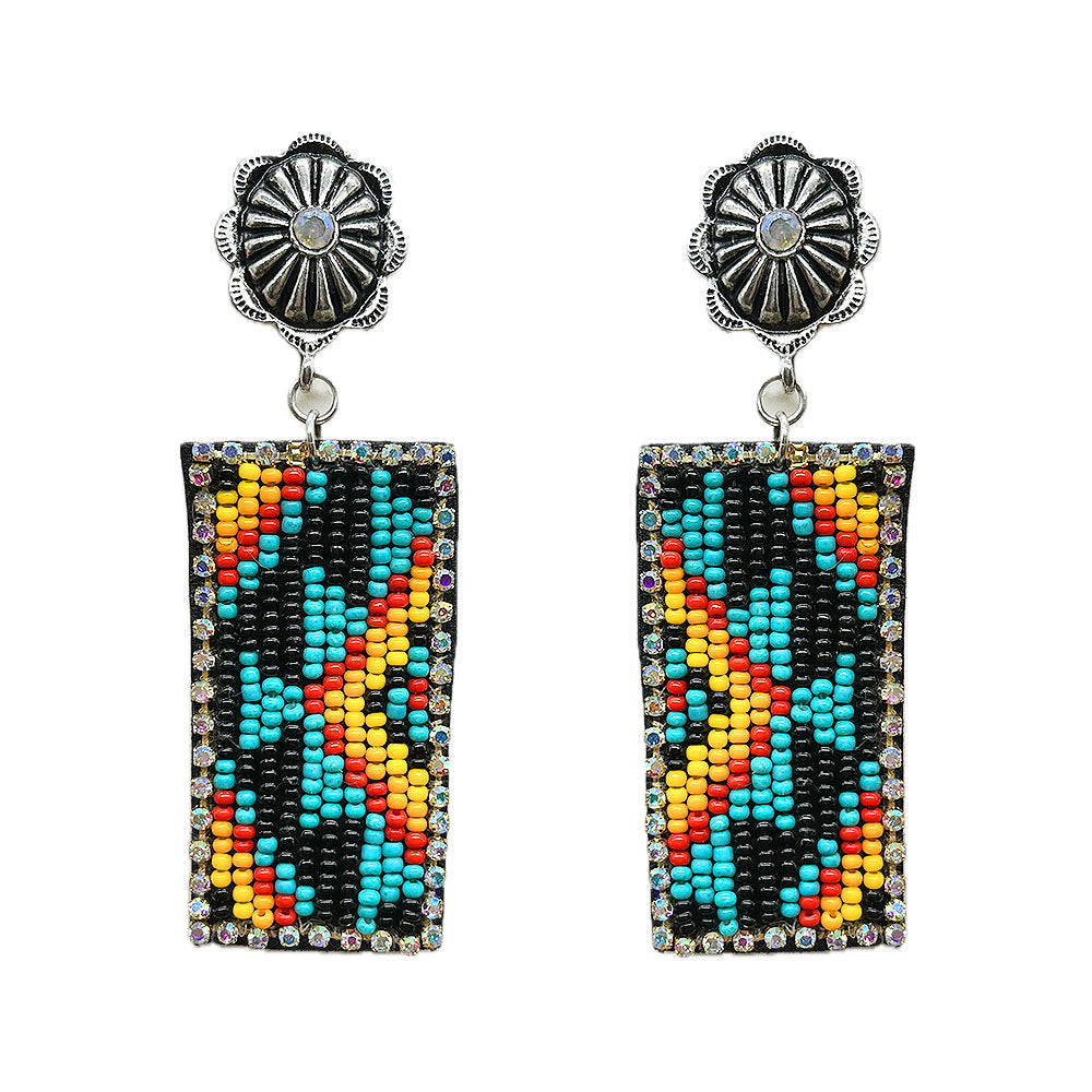 Concho stud with black, red, yellow, and turquoise seed dropped earring outlined with crystal. Light weight