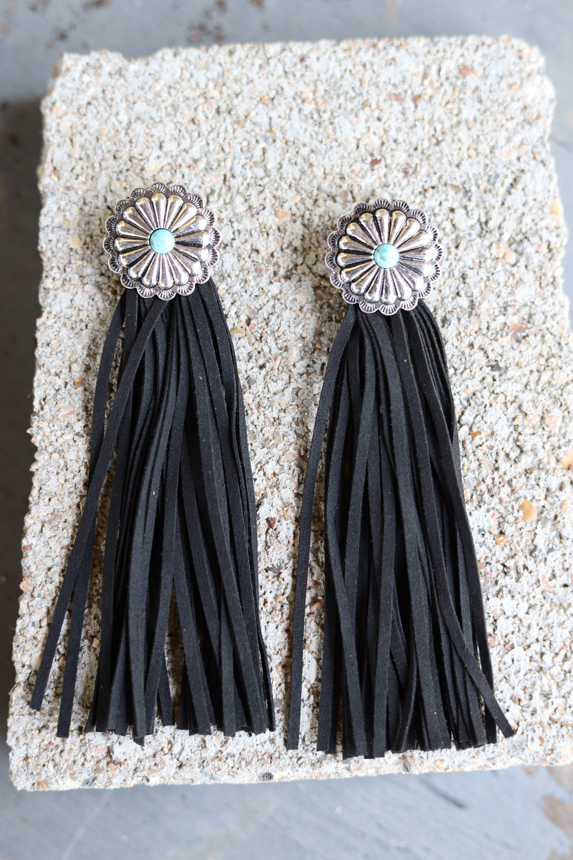 The faux silver concho post earrings with faux leather tassels. These earrings feature a big and bold design while remaining lightweight, making them comfortable to wear. The tassels are made of faux leather and measure approximately 4 inches long. They are available in multiple colors, allowing you to choose the one that suits your style or preferences. These earrings are designed to add a stylish touch to your outfits without the use of real silver.