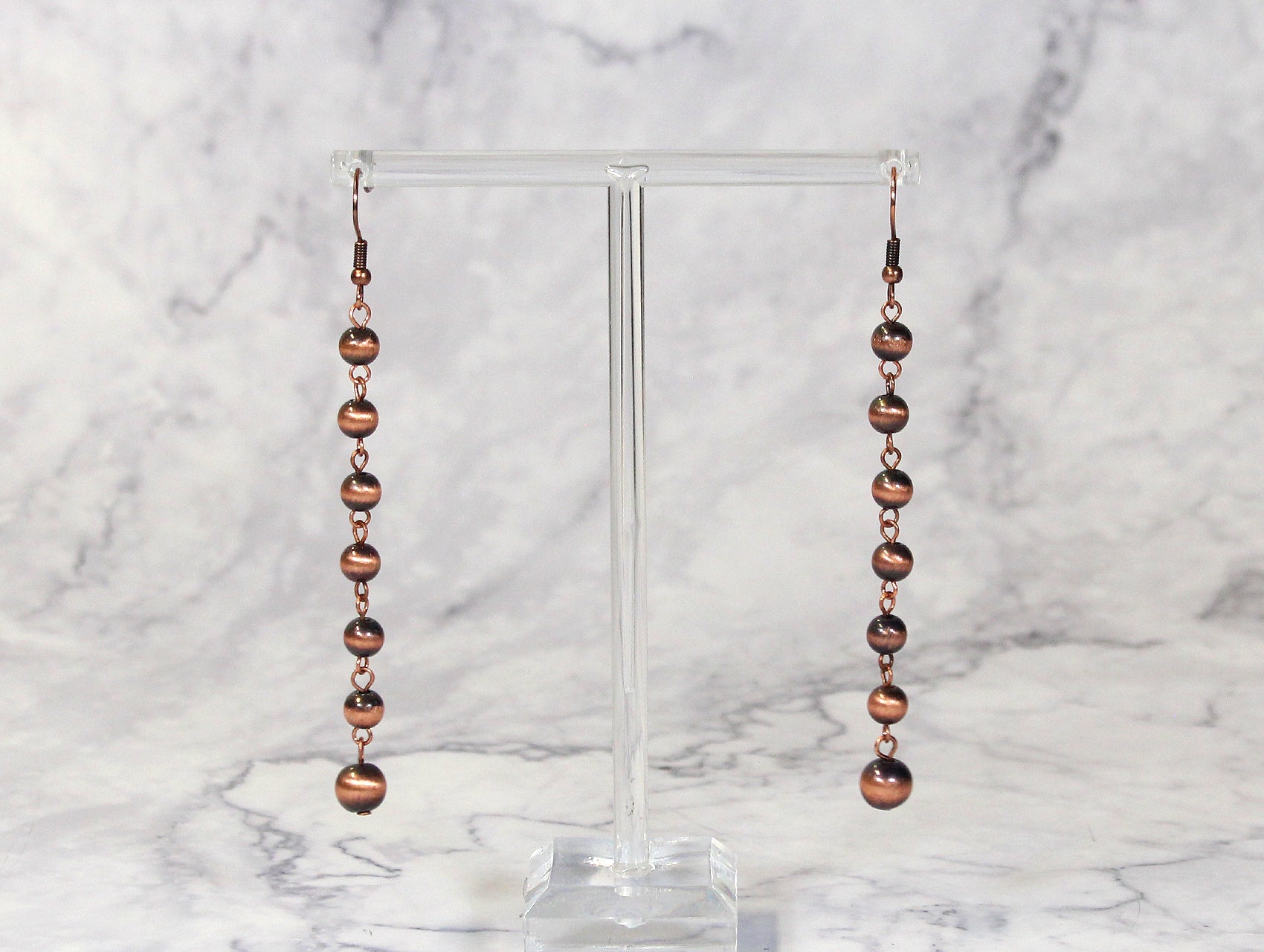 These elongated drop earrings feature a vertical sequence of round copper-tone beads in a graduated size pattern. Each bead is linked with short copper-tone connectors, creating a lightweight, articulated design that allows for subtle movement.