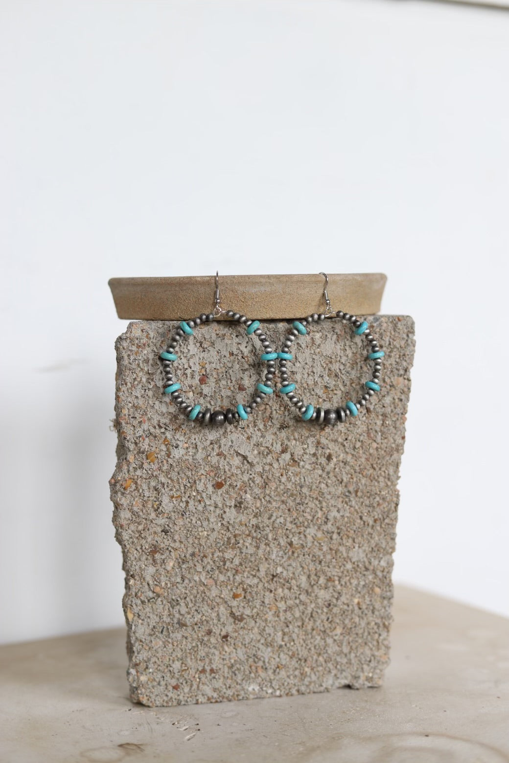 Introducing our stunning Faux Silver Bead Hoop Earrings with Turquoise Cylinder Stone. The vibrant turquoise hue adds a pop of color and an element of natural beauty to the earrings. The earrings ae placed on french wire and are 3 inches in size. The lightweight design ensures comfortable wear throughout the day or evening, while the secure closure provides peace of mind.