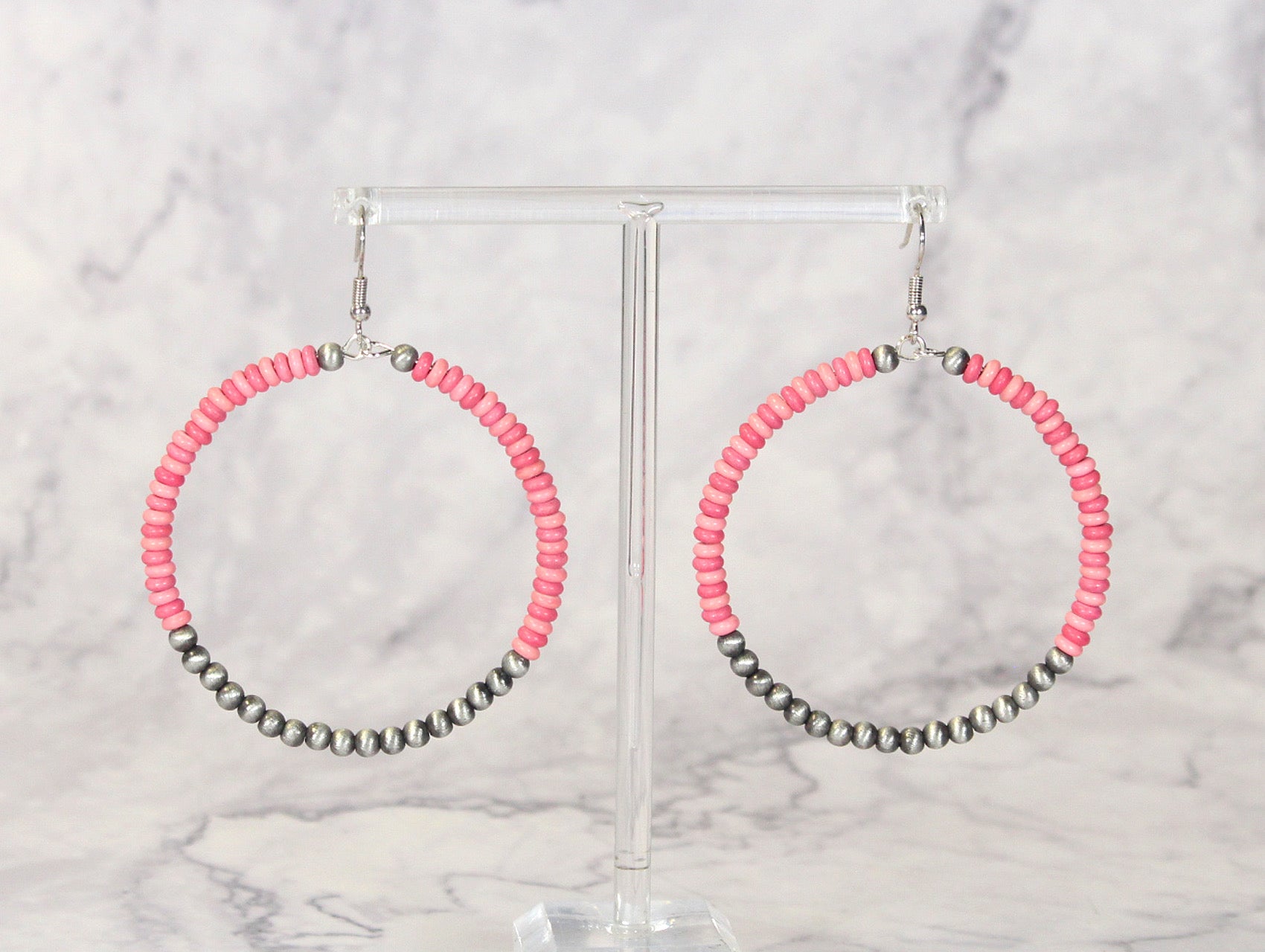 These large hoop earrings feature a structured wire base wrapped with a combination of pink-colored beads and silver-tone metallic spacers.