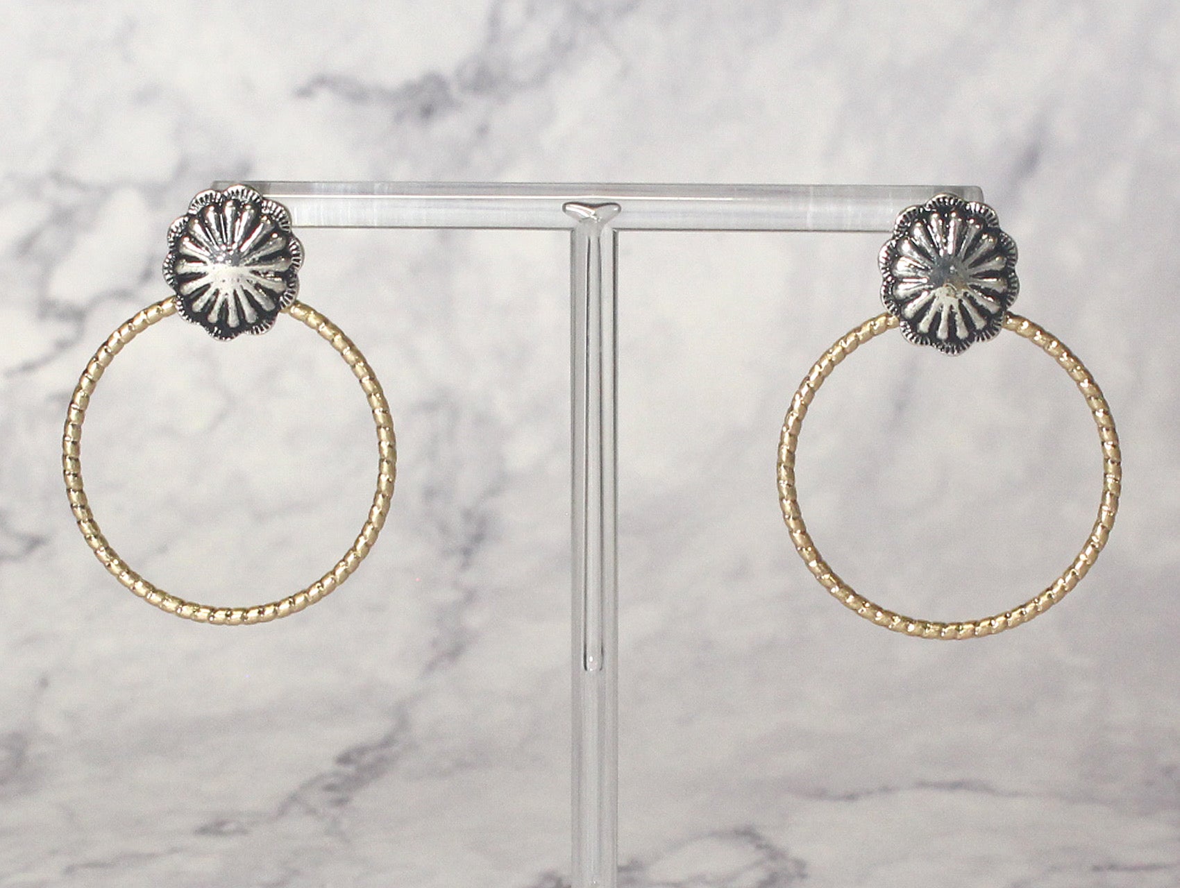 Add a touch of elegance to your look with these Floral Stud Hoop Earrings. Featuring a stunning combination of a delicate floral-shaped stud and a sleek hoop, these earrings offer a stylish fusion of vintage charm and modern design. The intricate floral detailing on the stud contrasts beautifully with the simplicity of the hoop, making them perfect for dressing up any outfit, from casual chic to formal attire. Lightweight and easy to wear, these earrings are a versatile addition to your accessory collection.