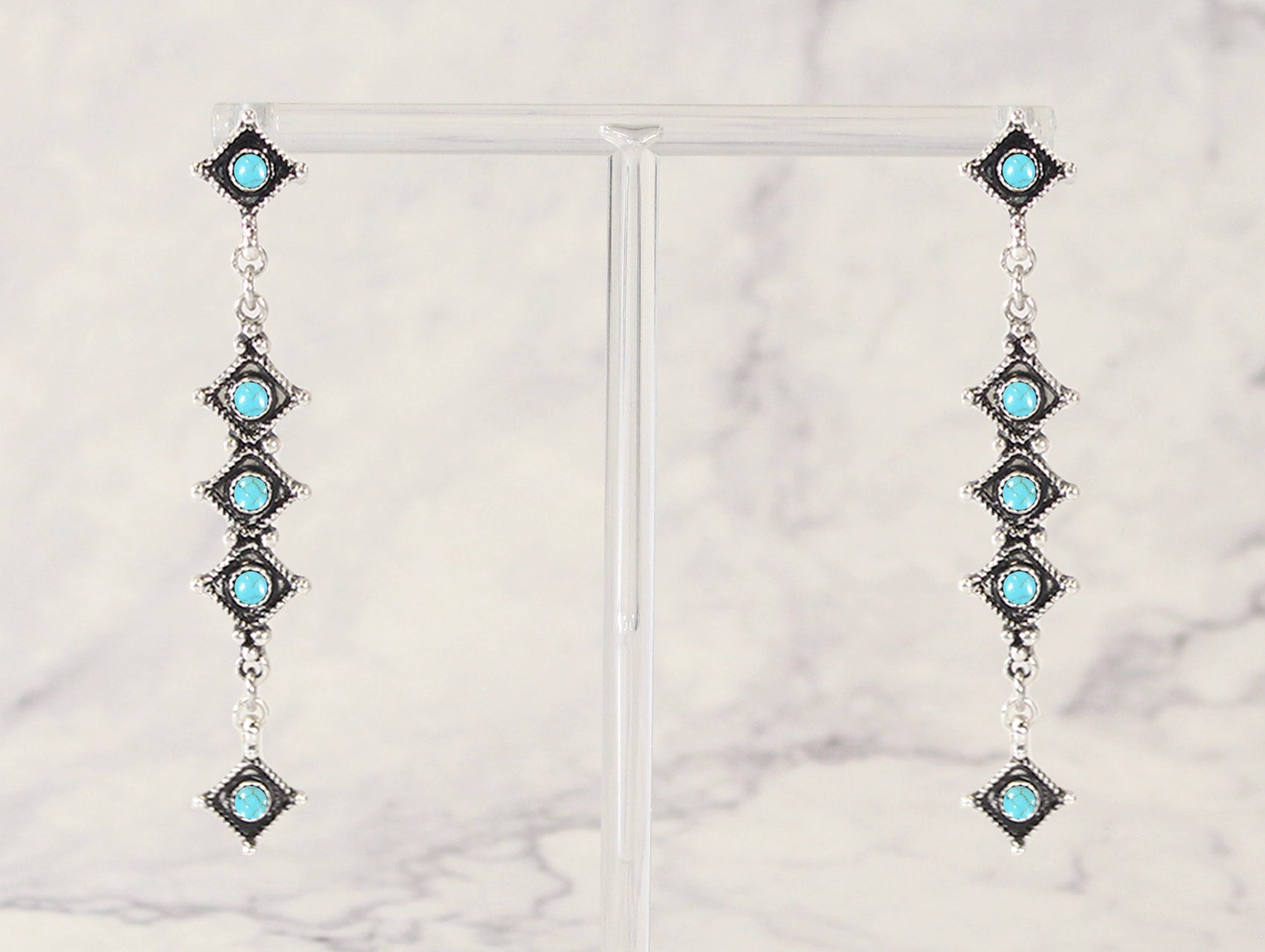 These long, linear drop earrings feature a stacked diamond motif accented with vibrant turquoise-colored centers. Details include: