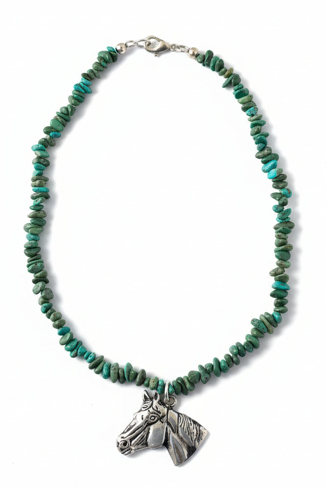 Handmade necklace featuring a bold horse pendant and vibrant green stone chips.