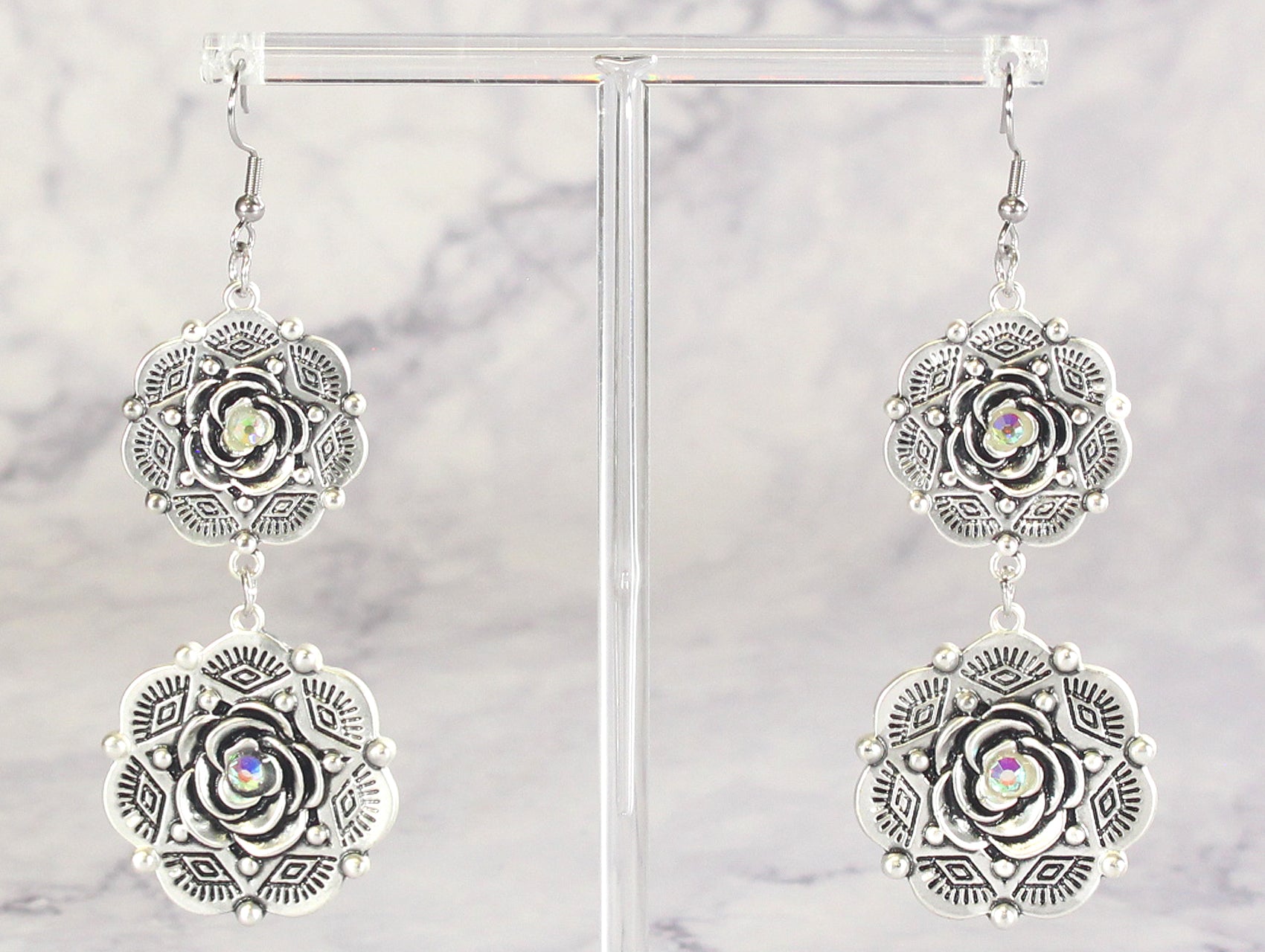 Western wear boutiques, bohemian accessory shops, or vendors seeking detailed, mid-size dangle earrings that pair well with denim, maxi dresses, or rustic festival attire.