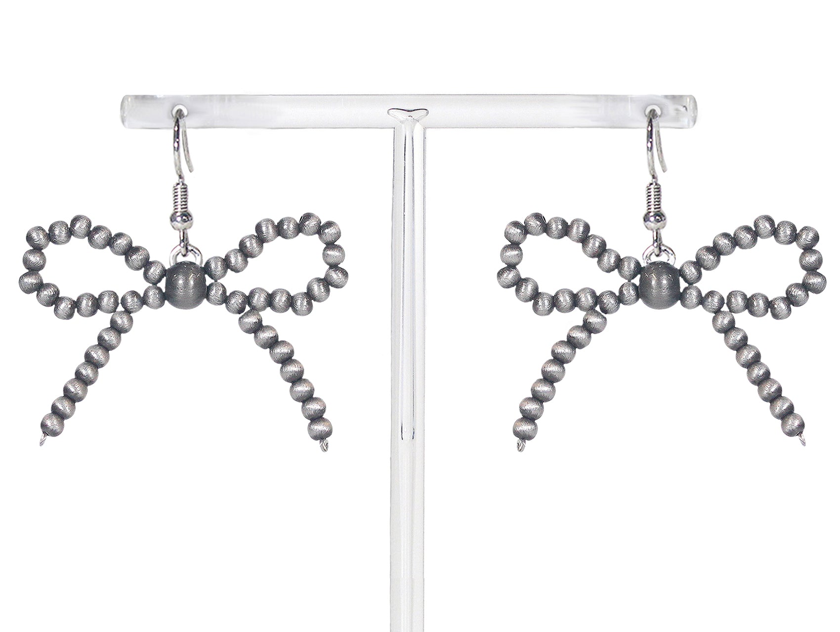 These beaded bow earrings offer a playful and feminine silhouette with a silver bronze finish. Shaped into a stylized bow, each earring is constructed from small round bronze beads with a larger center bead anchoring the design. The lightweight construction and whimsical form make these earrings ideal for casual or themed accessory lines.