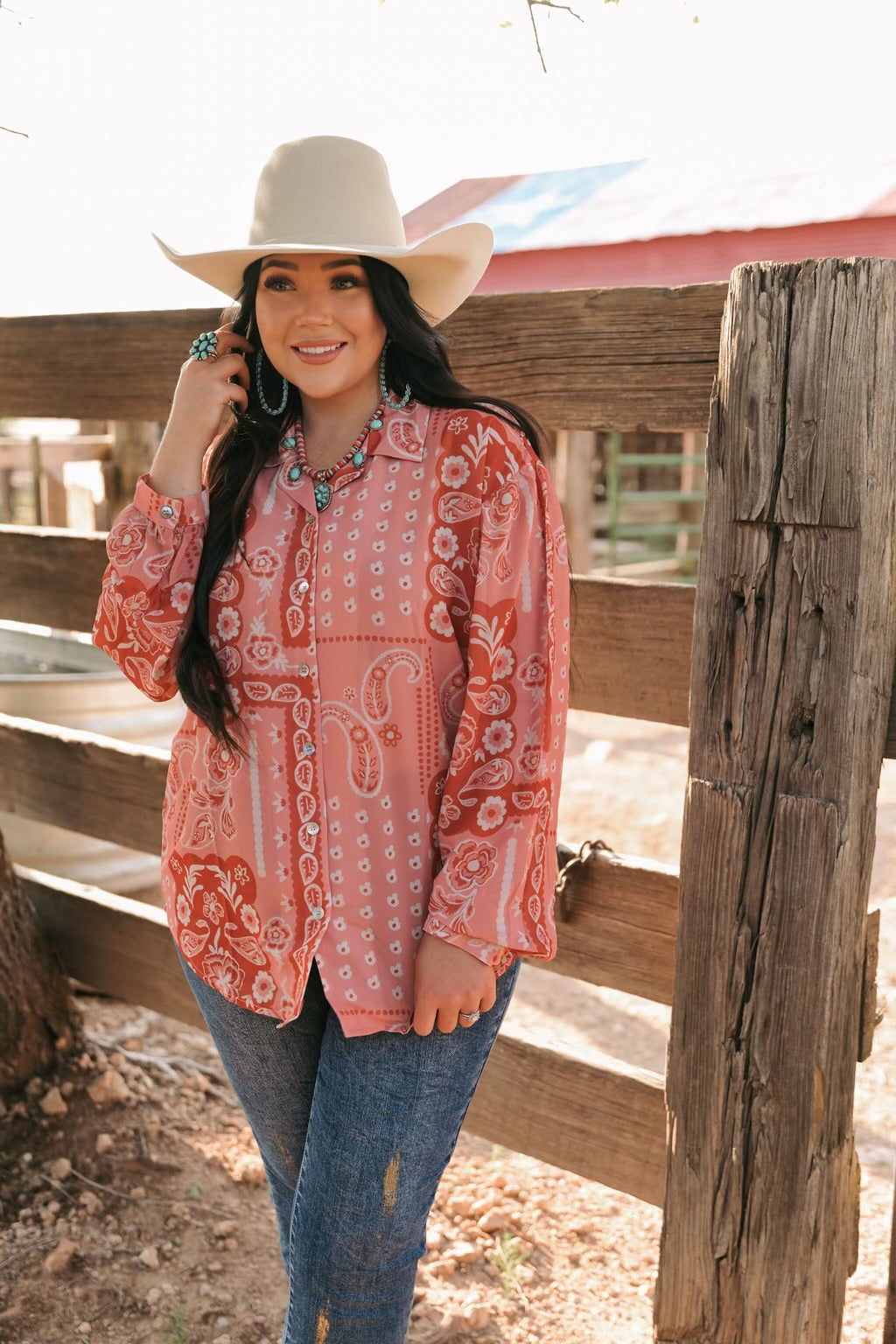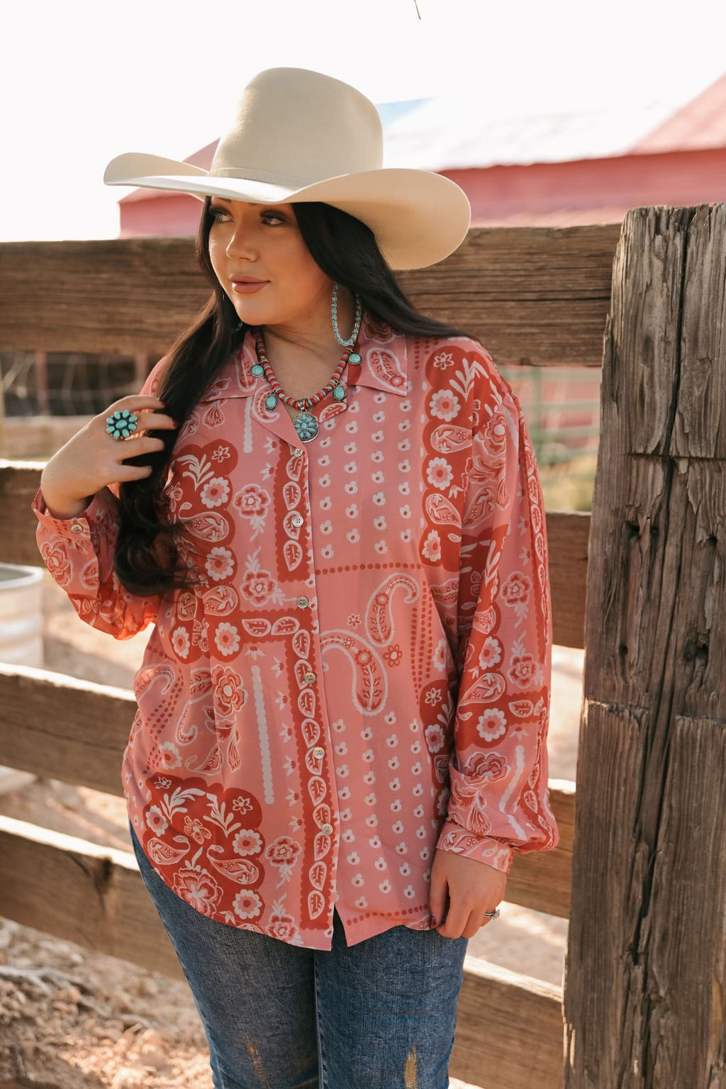 - Color/Pattern: Warm red and blush tones with a classic paisley and floral print, adding a touch of Western-inspired charm.