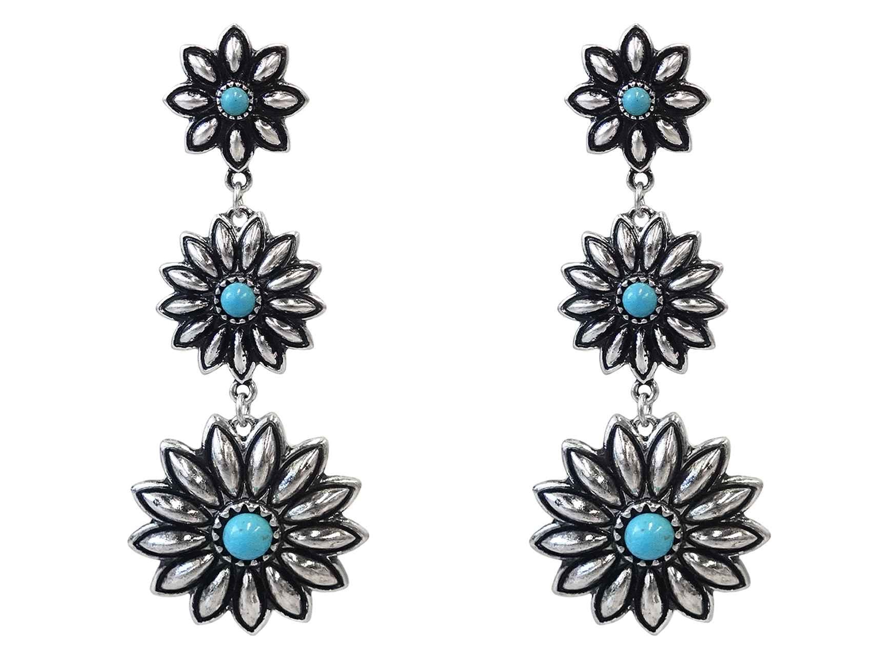 These cascading floral earrings feature three linked flower motifs in a turquoise tone finish. Each flower is detailed with layered petal textures and centered with a round faux white stone featuring subtle veining for a natural look. The graduated size of the flowers adds dimension and movement to this Western-inspired design.