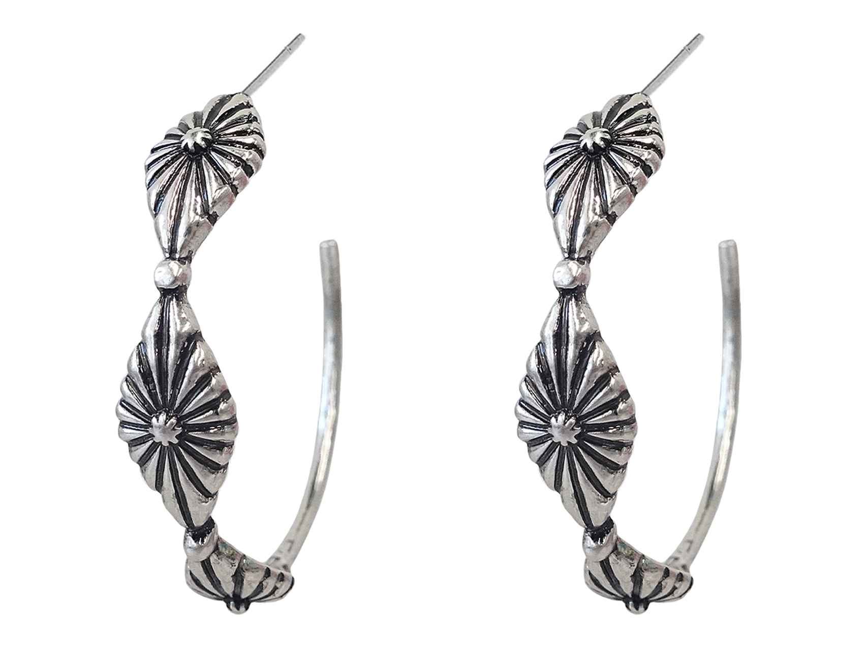 These hoop earrings feature a series of embossed concho-style segments in a warm, antiqued silver-tone finish. Each segment is detailed with radial stamping for a sunburst effect, adding Western-inspired texture and dimension. The open-back hoop design offers lightweight wear with bold visual appeal.