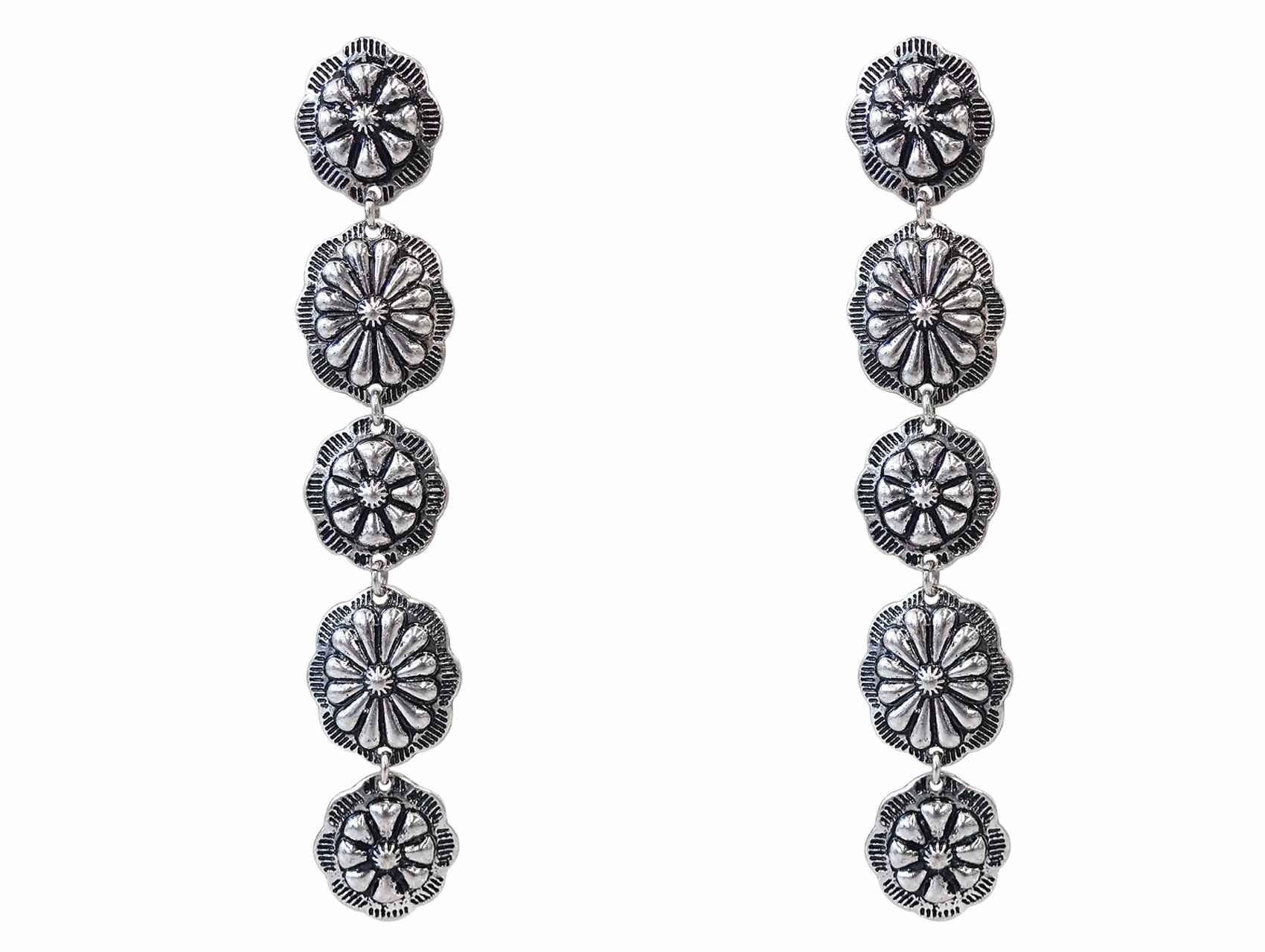 These long dangle earrings feature five vertically linked concho-style medallions, each with embossed floral and radial designs. The antiqued silver tone finish highlights the stamped textures, offering a handcrafted Western aesthetic. Lightweight for their size, these earrings create a bold silhouette with comfortable wear.