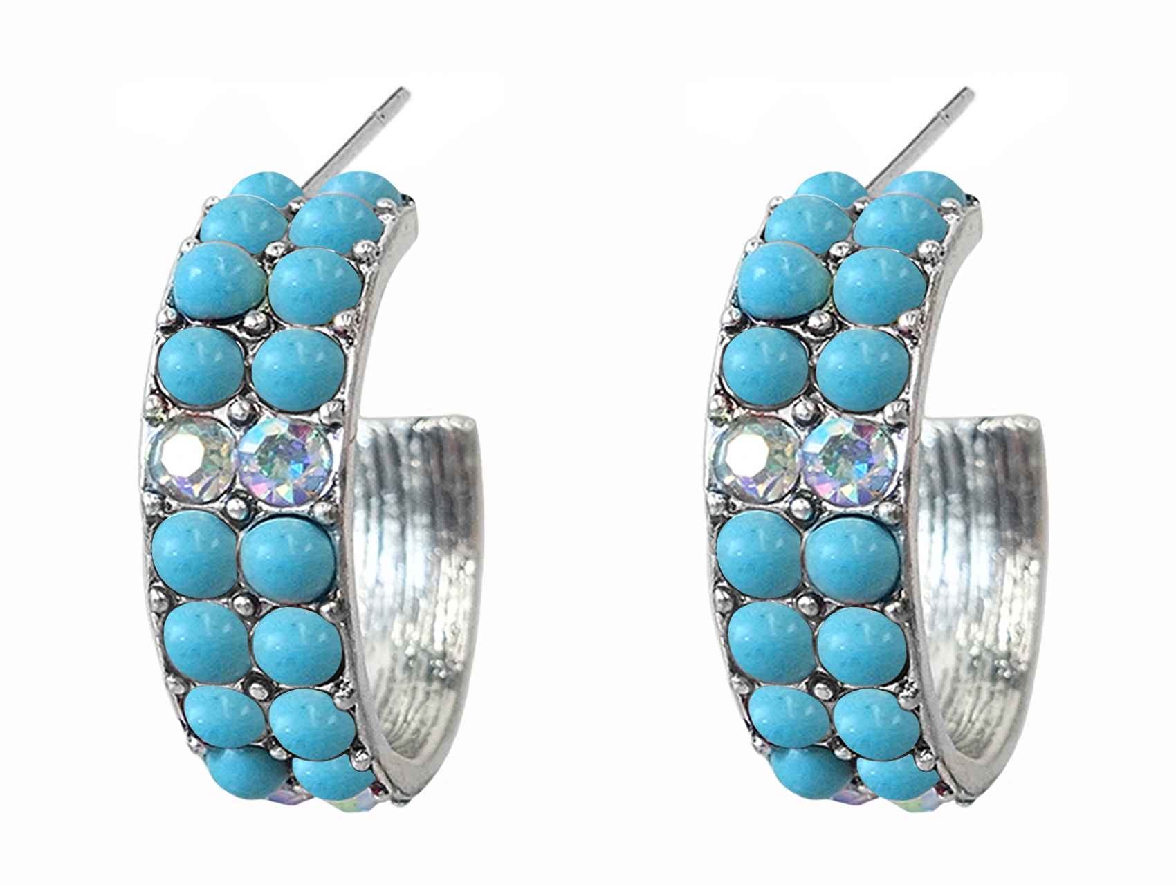 These bold hoop earrings feature a double row of round faux turquoise stones accented by a central row of faceted iridescent rhinestones. Set in a silver-tone metal base, the raised pavé-style setting offers maximum texture and shine. The inside of the hoop features a ribbed finish for added detail.