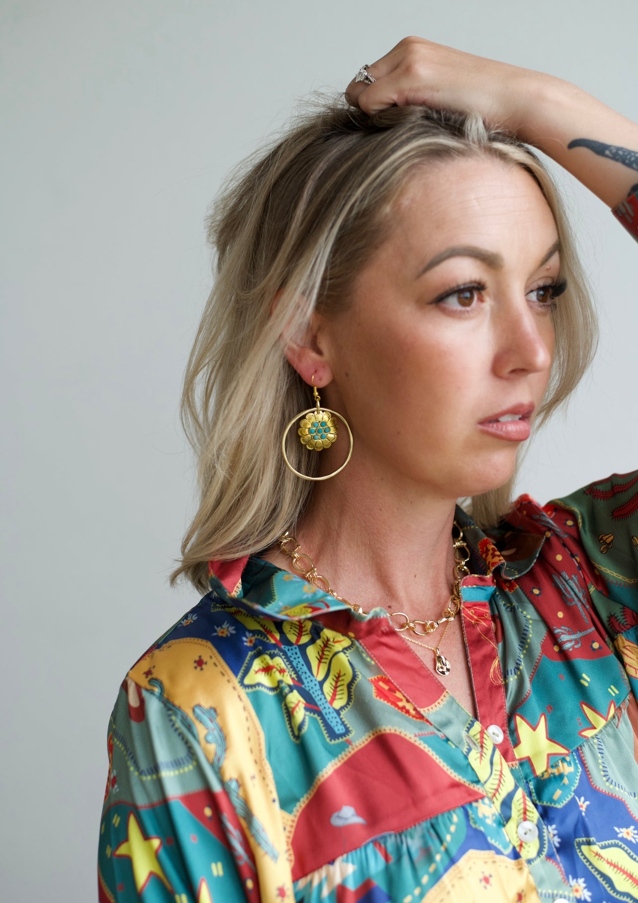 Handmade Gold Hoop Earrings with Turquoise Floral Center