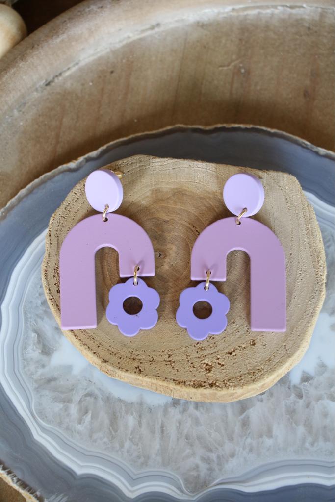 Purple ‘U’ shape earring with a purple daisy drop.