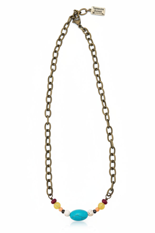 - Material: Antiqued metal chain with multi-colored natural stone beads