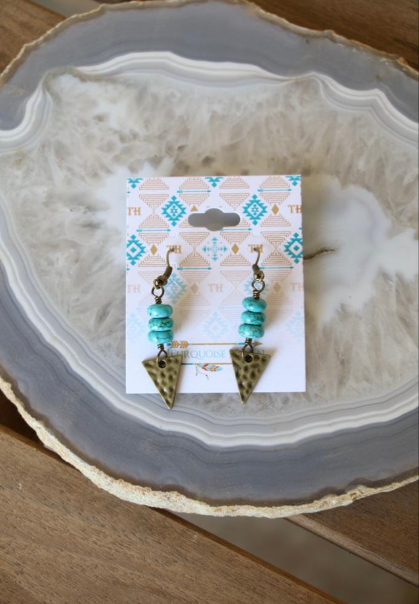 Antique gold textured triangle dangle with stacked turquoise charms.