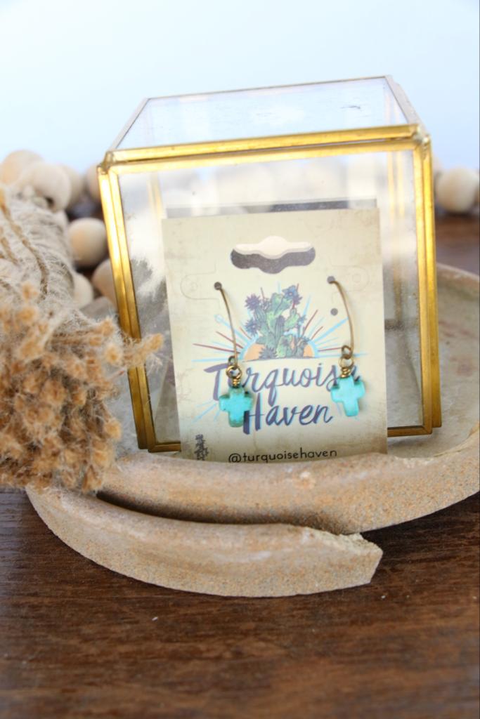 An antique gold hook earring with a turquoise cross dangle