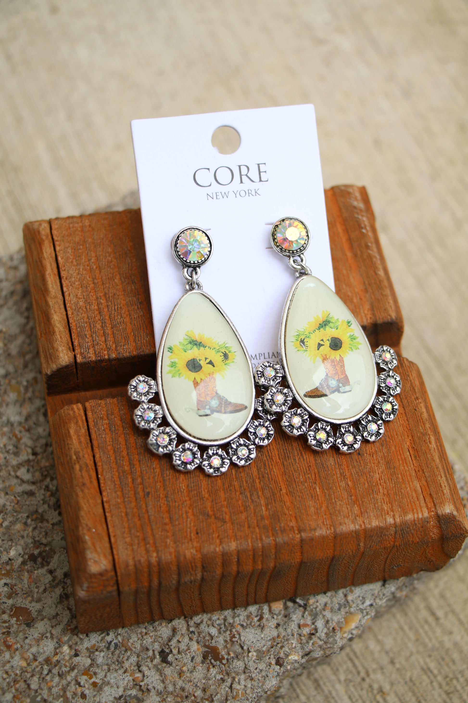 AB crystal stud with oval photo of boot sunflower with glass top. with crystal embellished flower detail around bottom of each earring