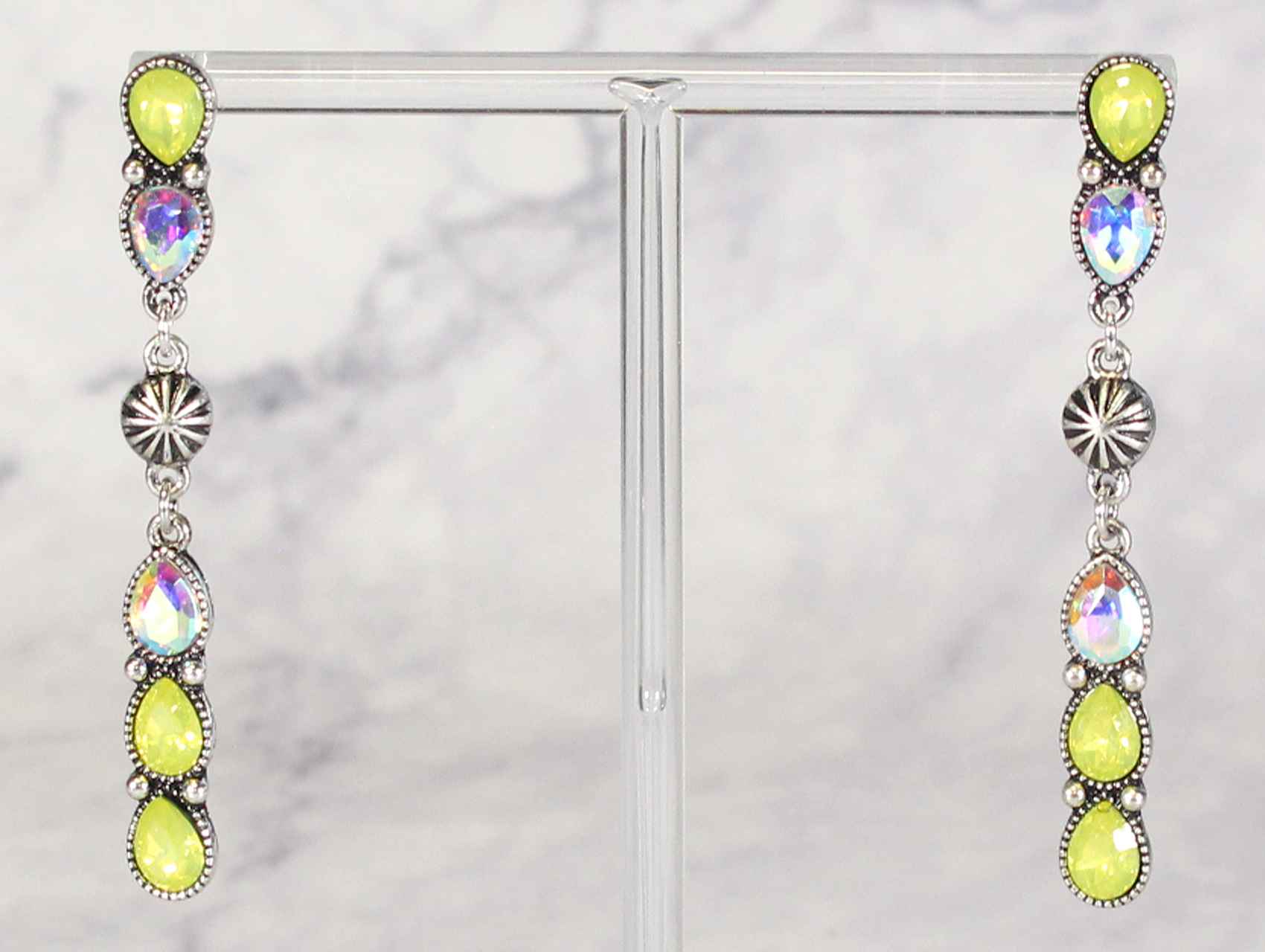 The earrings in the set are elegant drop earrings that beautifully echo the chartreuse palette of the necklace. They feature a cascading design of circular elements that create a playful yet sophisticated look. Lightweight and comfortable to wear, these earrings add just the right amount of flair to elevate any outfit. Perfect for pairing with the statement necklace or wearing solo for a touch of color and charm.