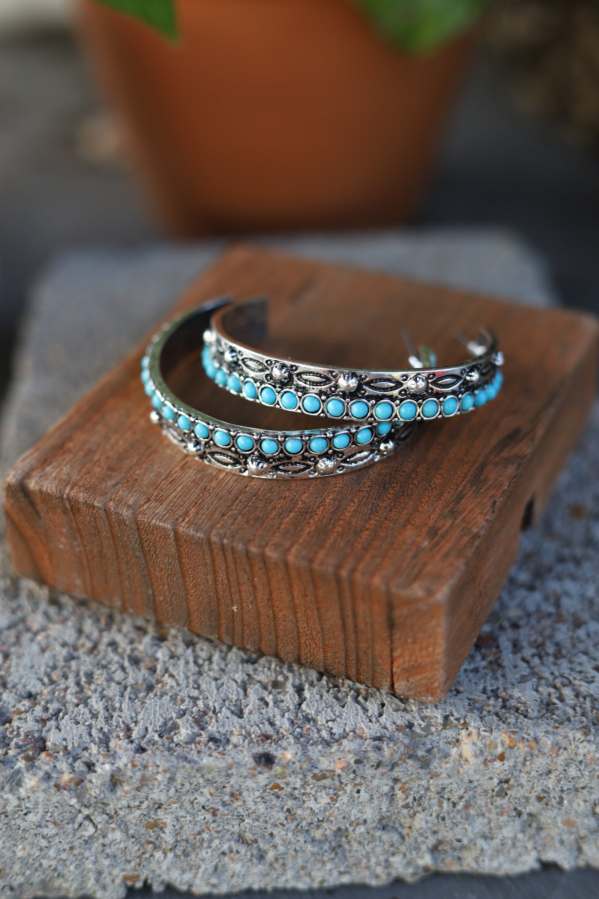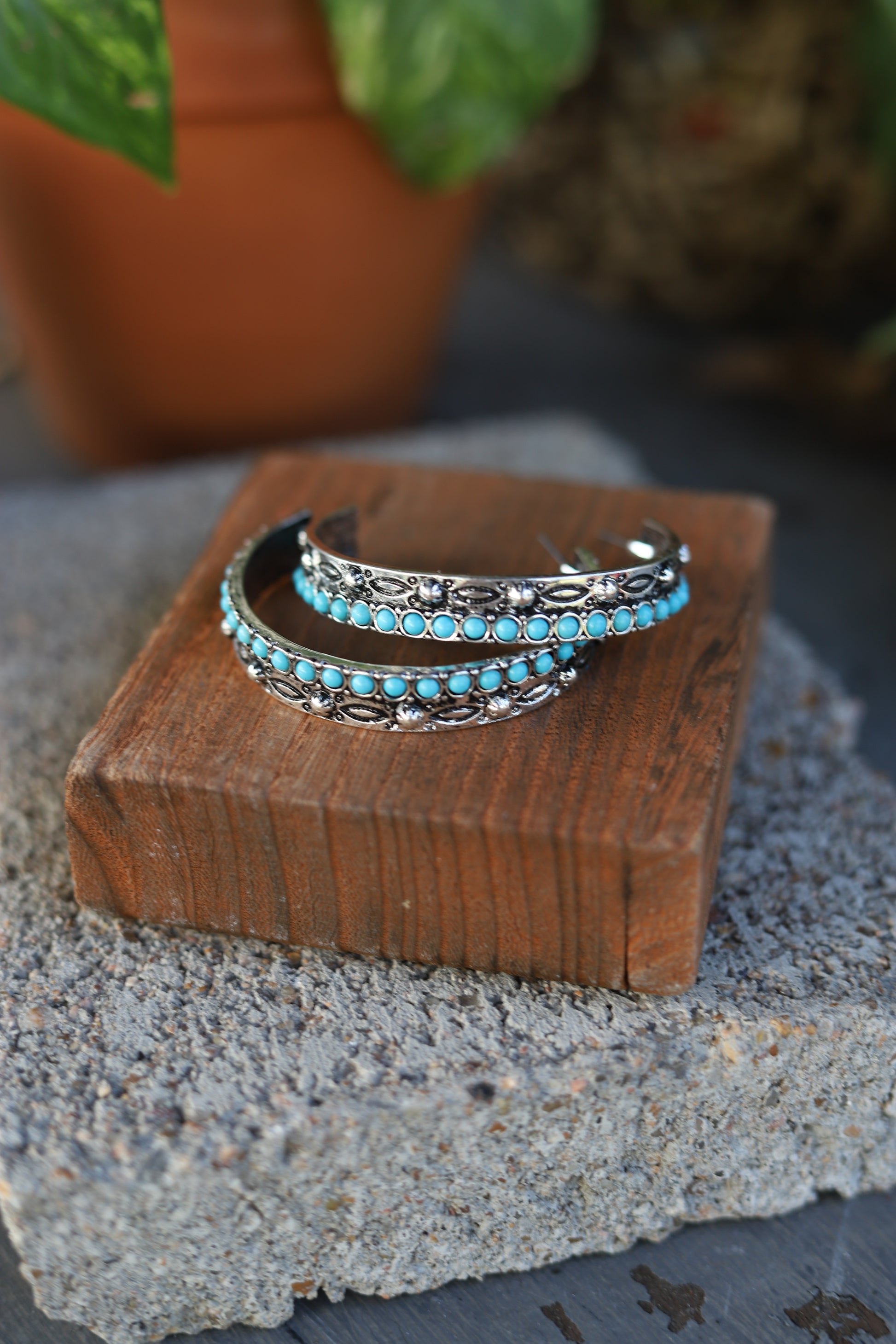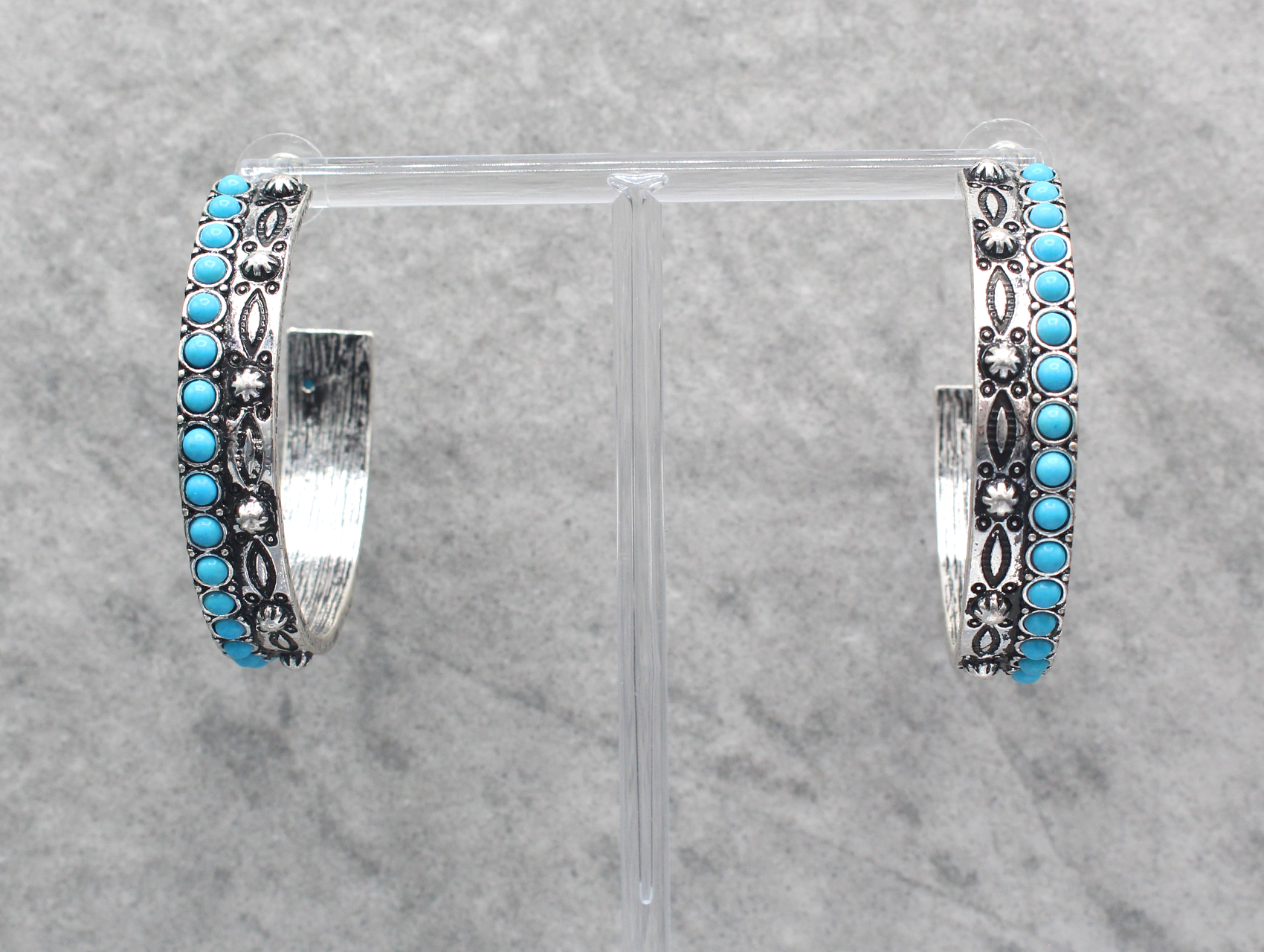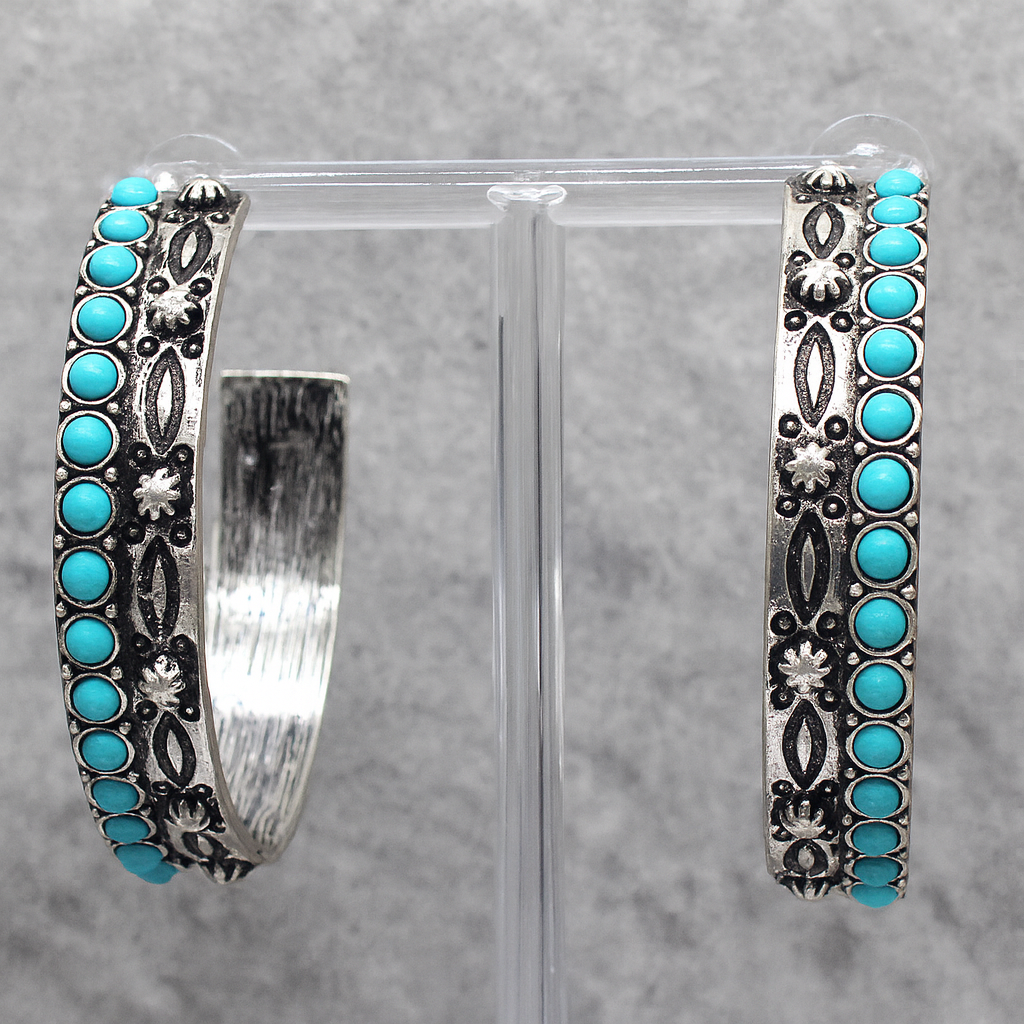 These 2.5" hoop fashion earrings feature detailed metal stamping along the outer surface, offering a textured, artisan-style look. Accented with faux turquoise stones, they provide the appearance of natural stone without the added weight or cost. The earrings are lightweight and easy to wear, making them a versatile choice for everyday outfits or casual boutique collections.