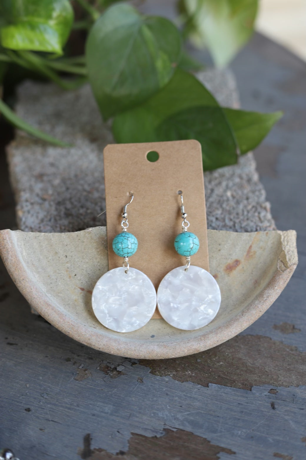A white acrylic circle with a turquoise bead on a silver fish hook earring. Handmade in USA.