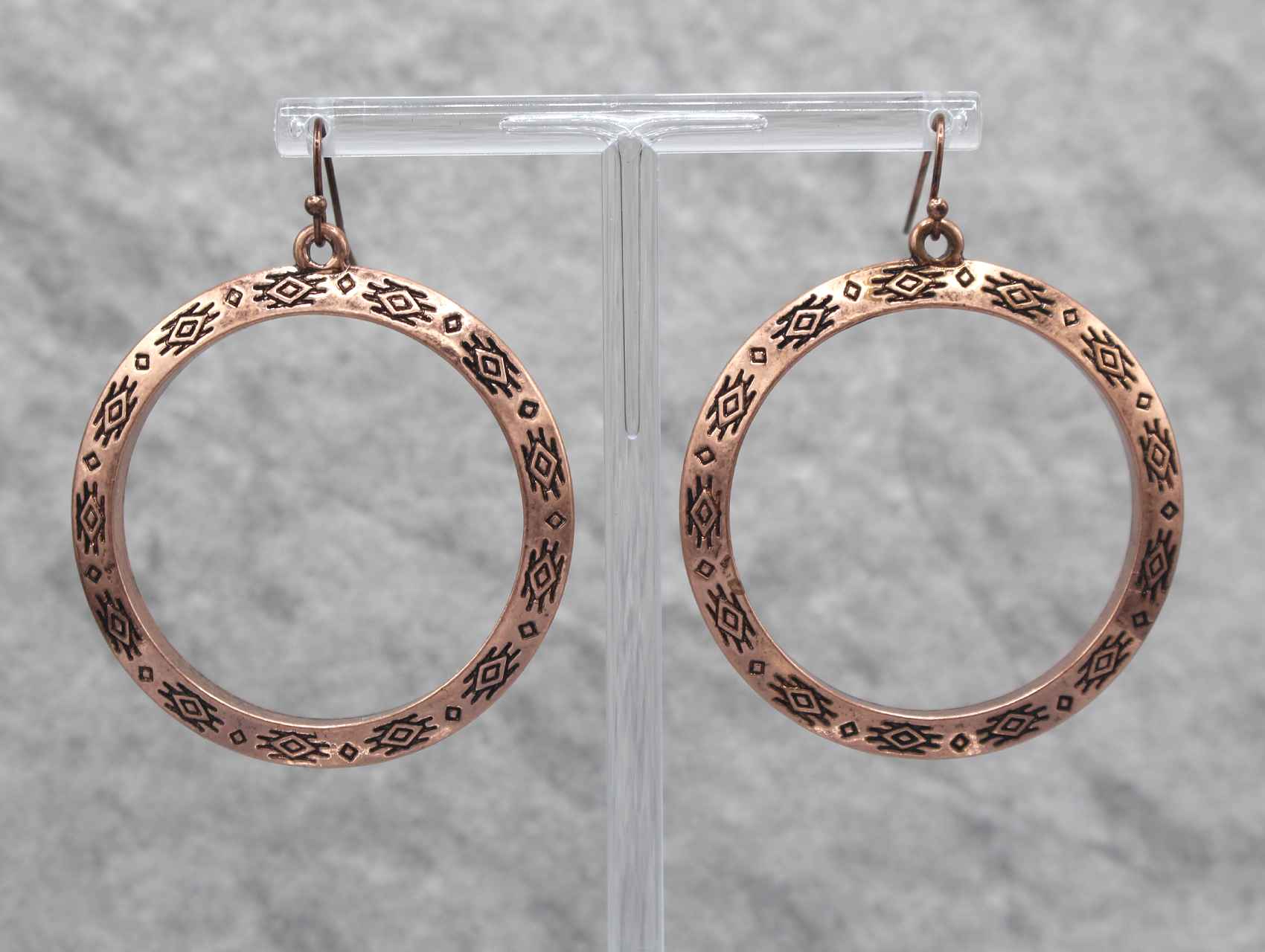 These round dangle earrings offer a rustic yet refined look with a copper-tone finish and etched geometric detailing. Each open hoop features a uniform pattern of tribal-inspired diamond motifs engraved along the outer surface, giving the piece a textured, artisanal character. The earrings are lightweight and suspended from simple fishhook ear wires for easy, comfortable wear.