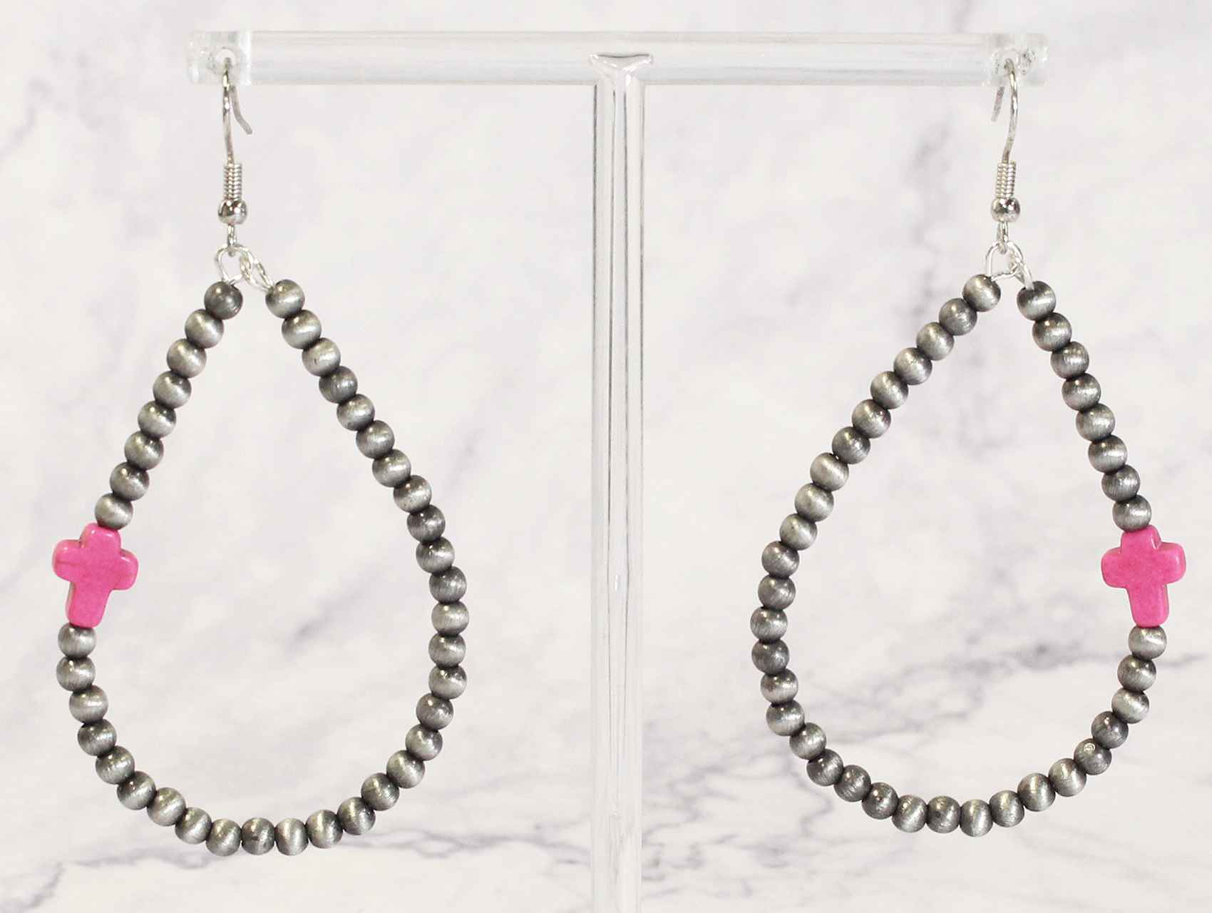 These lightweight teardrop earrings combine metallic-toned round beads with a bold pop of color. Each earring features a loop of matte silver-tone beads strung in a teardrop shape and highlighted by a single bright pink cross bead placed off-center. Suspended from standard fishhook ear wires, this design offers both spiritual symbolism and a modern Western look.