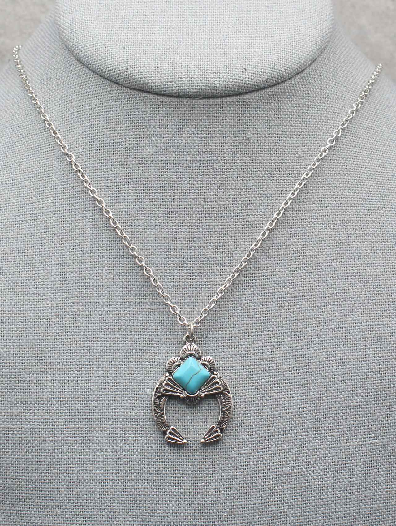 • Design: Squash blossom pendant with intricate silver-tone details and a vibrant turquoise stone