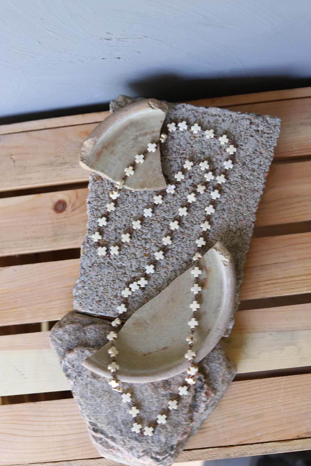 Introducing our Bone Cross Layering Necklace. Focal point of this necklace is the cross-shaped bone bead, wire-wrapped to create an eye-catching design. Measuring at 36" length, this necklace allows you to customize the layering to suit your neckline and personal style preferences. The secure clasp ensures that the necklace stays in place.
