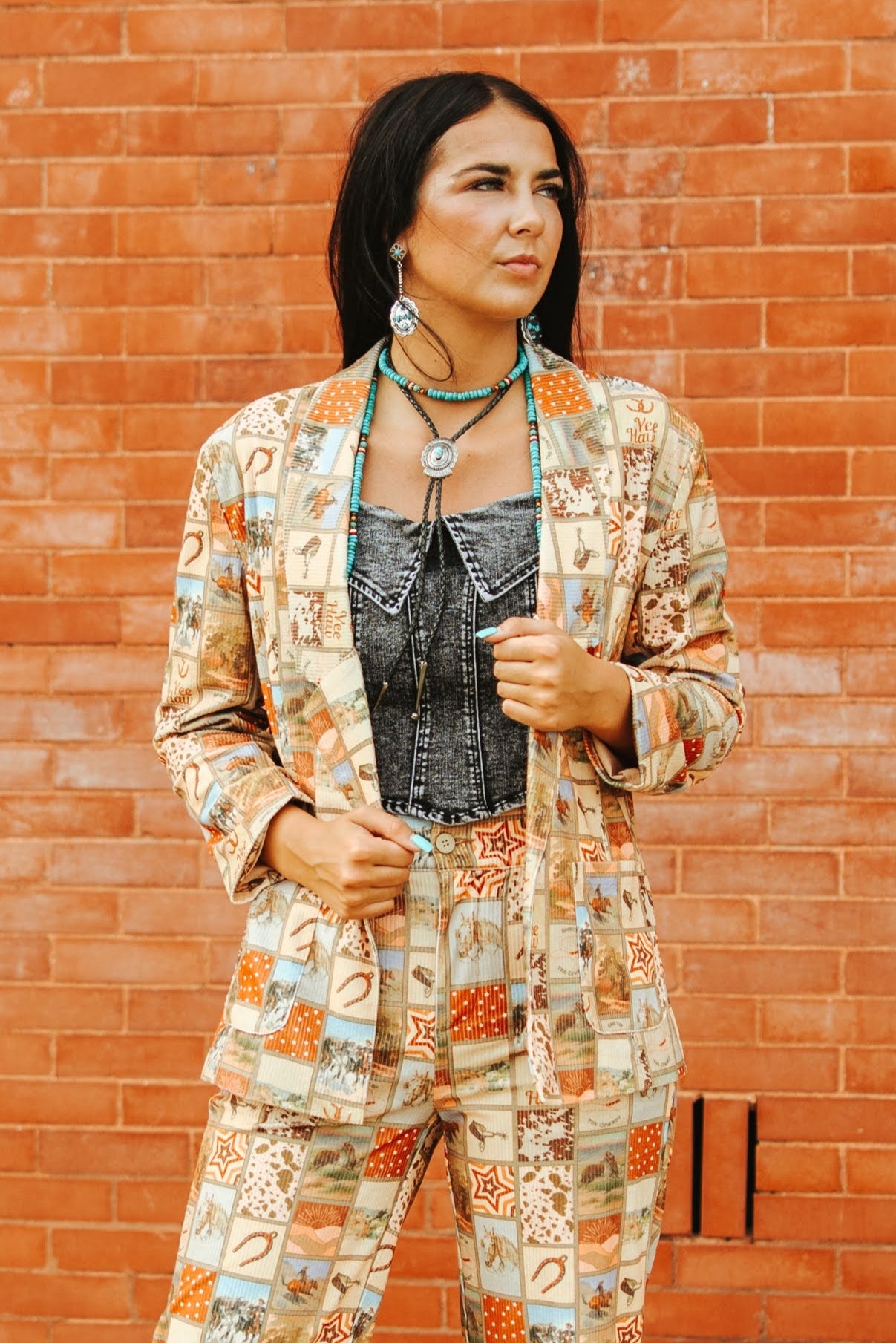 This Western-inspired corduroy blazer showcases a colorful patchwork print featuring cowboy hats, boots, stars, horses, and “Yee Haw” graphics in warm desert tones. Designed with a notched lapel collar and single-breasted button closure, it offers a structured yet comfortable fit. The soft corduroy fabric adds texture and vintage charm, while the front flap pockets provide functional detail. Wear it with the matching pants for a bold coordinated look or style it with denim for a statement layer.